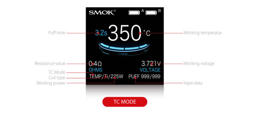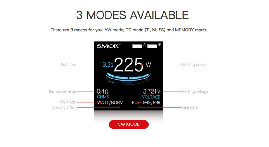 such as VW/TC MODE, vaping effect, voltage, battery life, resistance value etc.