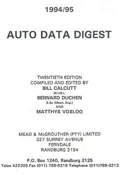 Auto Data Digest 1994/95 By Bill Calcutt & Bernard Duchen & Matthys Vosloo