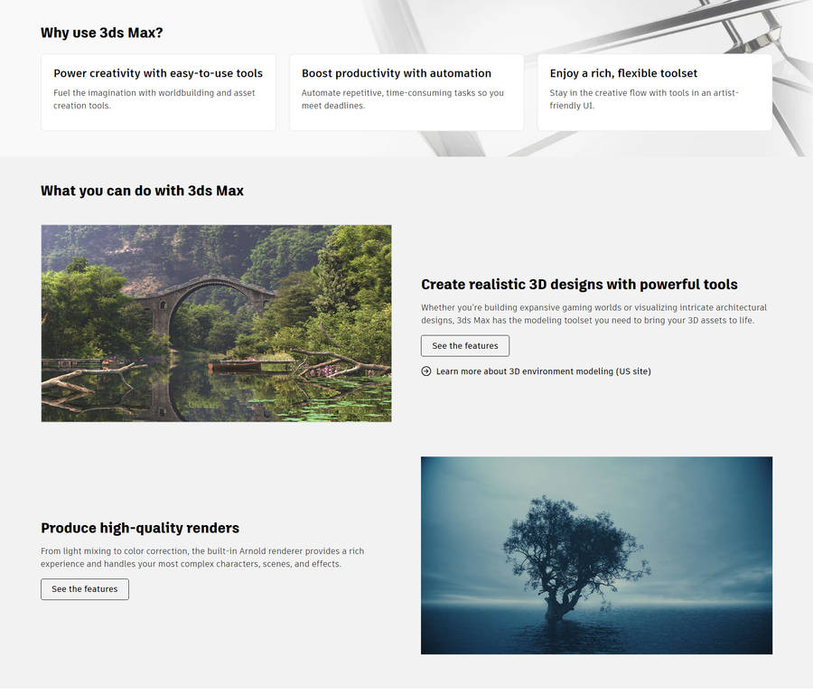 Autodesk 3ds Max professional 3D modeling, rendering, and animation software enables you to create expansive worlds and premium designs.