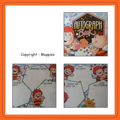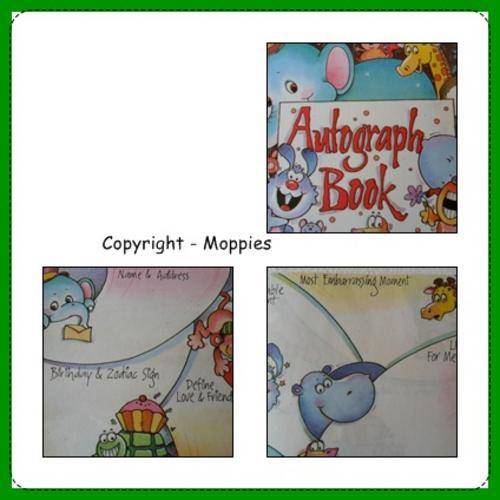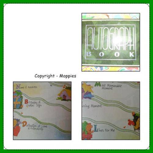 Autograph book with beautiful drawings and text - 47 pages of good memories from friends Book size: 11 x 14 cm Text includes: Name and address Birthday and zodiac sign Define love and friendskip Most embarrising moment ost memorable moment Lines for me Shipping