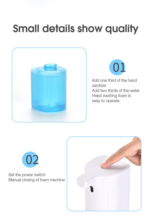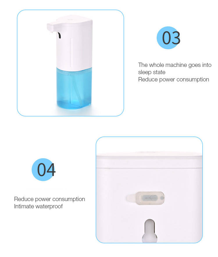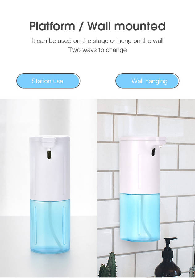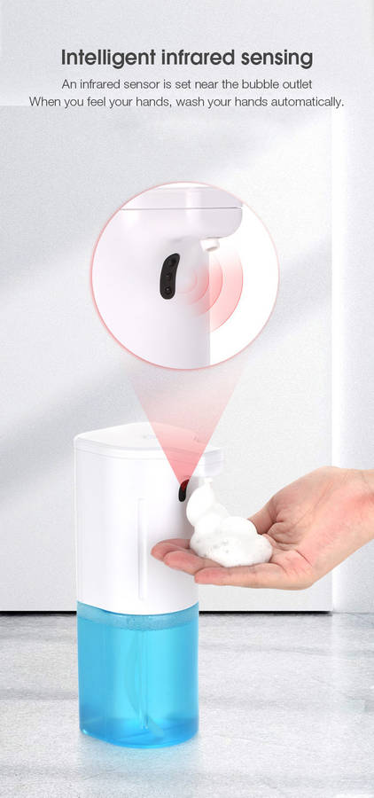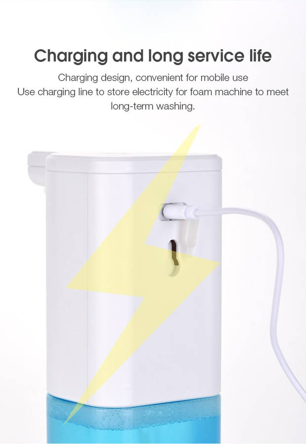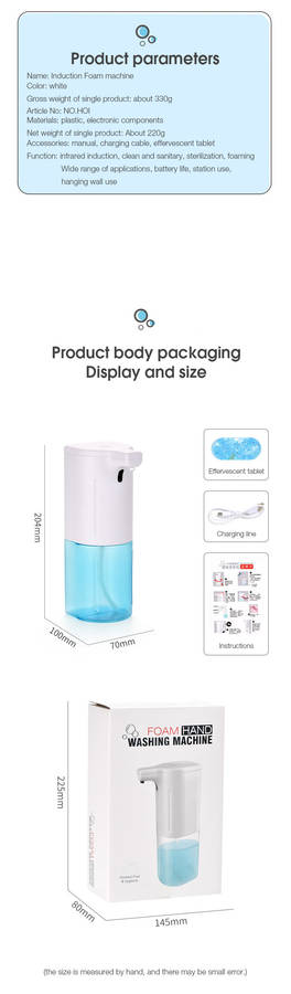Description : Automatic Soap Dispenser USB Charging Induction Hand Washer Infrared Motion Sensor Foaming Soap Dispenser with UV Sterilize Light Features : - Intelligent infrared sensing - Wall hanging - Charging and long service life - Foam bottle capacity is large, a bottle of foam can be used 400 times Specifications :