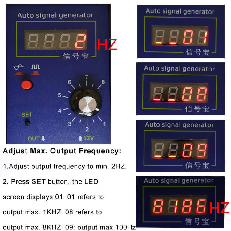 -When the signal generator output is higher than 2HZ, press SET button, it can output 10 types of signal, 60-0 represents standard magnetoelectric or Hall signal output, the other 9 types of signal are magnetoelectric or Hall gear missing teeth signal (Crankshaft position sensor signal).