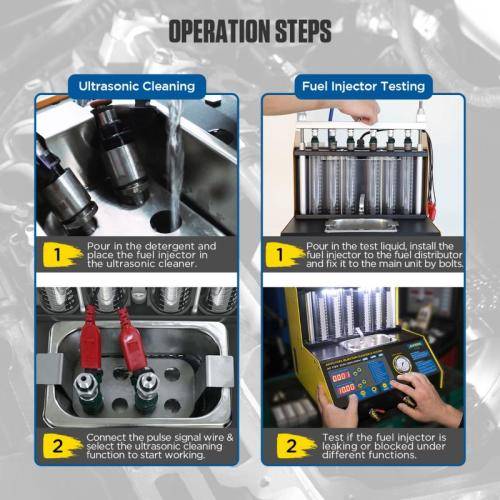 - Ultrasonic cleaning: It sends signals to the injectors through the pulse signal line, using the cleaning fluid with the ultrasonic vibration so as to completely remove the carbon and impurities inside the injectors.