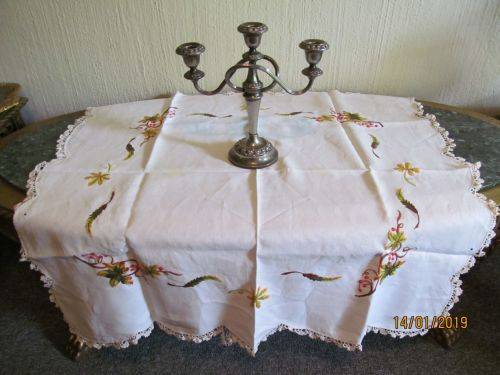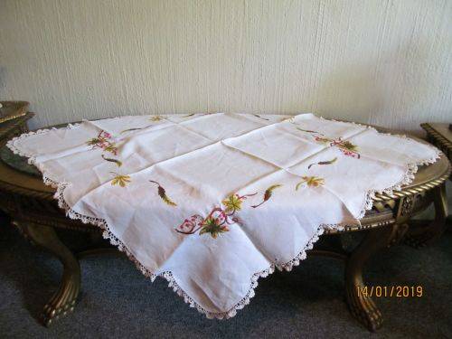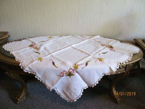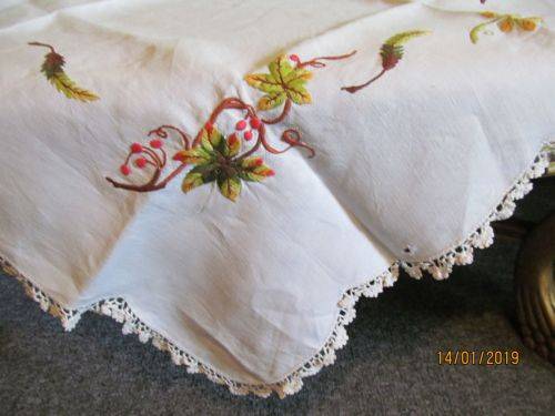 PERFECTLY AND IDEALLY SUITED FOR A 4-SEAT SQUARE SHAPED TABLE OR AS A DECORATIVE COVER, THIS VINTAGE TABLECLOTH IS A WHITE LINEN TEXTILE WITH A CREAM COLOR CROCHETED BORDER AND A MAGNIFICENTLY EMBROIDERED AUTUMN COLOR PATTERN OF LEAVES, BRANCHES AND BRIGHT RED BERRIES. THE PATTERN IS BEAUTIFULLY EMBROIDERED AROUND THE VERGES OF THE TABLECLOTH