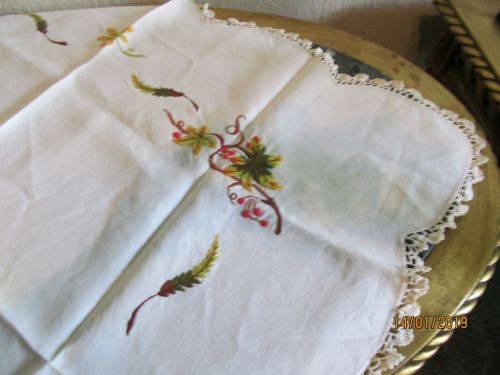 VINTAGE SQUARE SHAPED WHITE LINEN TABLECLOTH WITH CROCHETED CREAM BORDER AND AUTUMN COLOR LEAF & BERRY EMBROIDERED PATTERNS