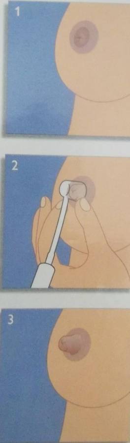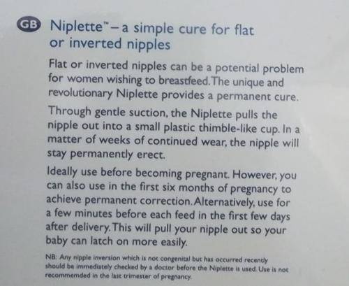 The Avent Niplette is a device invented by a UK plastic surgeon to provide a permanent cure for inverted or flat nipples. This ingenious device totally bypasses the need for invasive and expensive inverted nipple surgery, usually used to cure flat nipples. It is a medically proven device that can be used before pregnancy to cure flat nipples and therefore enhance breast feeding as it makes it easier for the baby to latch on easily. It works through gentle suction of the nipple into a plastic thimble-like cup. After approximately a month (depends on the individual), the nipple remains permanently erect.