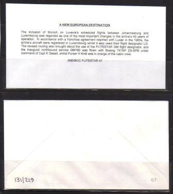 AVIATION - FLITESTAR FIRST FLIGHT COVER # 47 JNB/MUC 3-5/9/1993 - SELDOM OFFERED