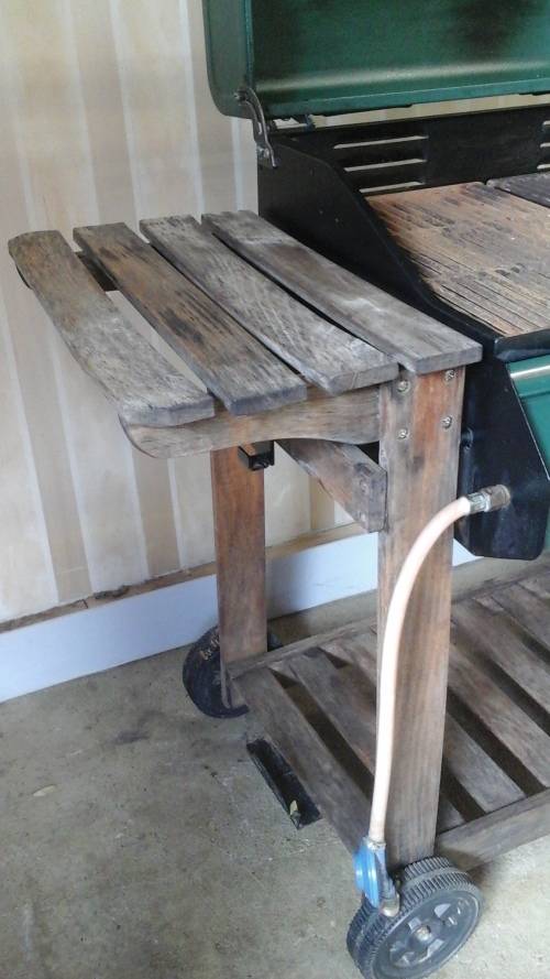 THE BRAAI ITSELF IS MADE FROM METALA ND IS GREEN IN COLOR. IT HAS A HINGED LID THAT CAN BE LIFTED WHEN BRAAING AND CLOSED WHEN NOT. INSIDE IS TWO CAST IRON GRIDS.