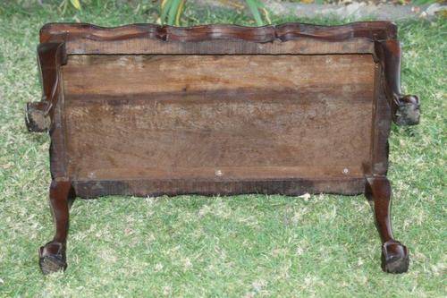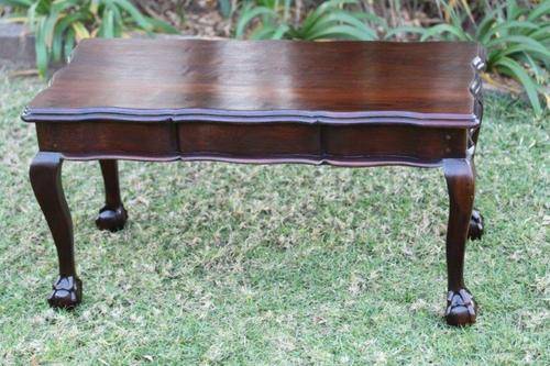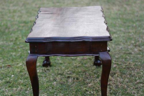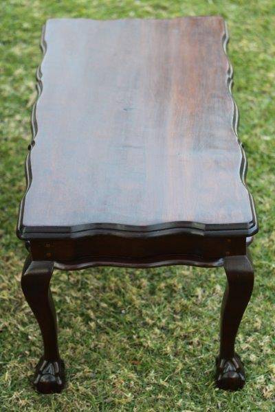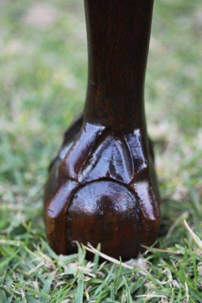 THIS SOLID BALL AND CLAW (PROPER EAGLE CLAW HOLDING A BALL) COFFEE TABLE IS AWESOME AND IN FANTASTIC CONDITION!!! I BELIEVE THE TABLE TO BE MAHOGANY BUT I AM NOT SURE SO PLEASE DECIDE YOURSELF WHAT THE TIMBER IS!!! ALL TOTALLY ORIGINAL THOUGH AND IN GREAT CONDITION!!!