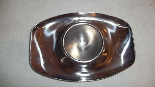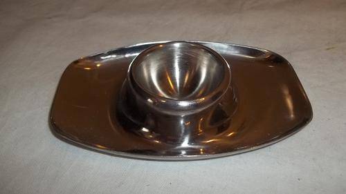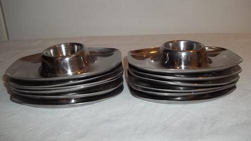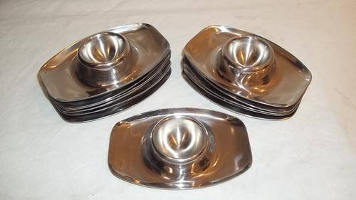 THESE VERY PRACTICAL STAINLESS STEEL EGG CUP HOLDERS ARE DESIGNED TO ACCOMMODATE A BOILED EGG AND HAS A SECTION FOR THE SHELLS. THERE ARE 12 EGG CUP HOLDERS IN TOTAL. THEY ARE STILL IN GREAT CONDITION WITH VERY MINIMAL WEAR AND TEAR. THE HOLDERS MEASURE 12cm x 8cm AND ARE STACKABLE.