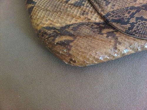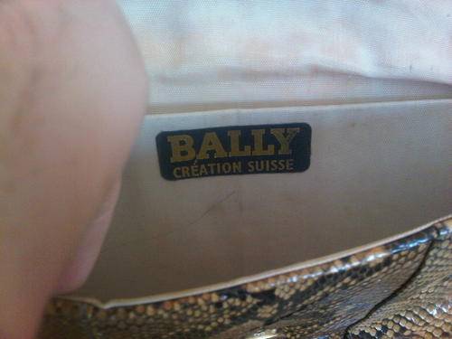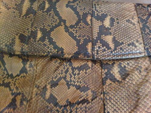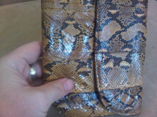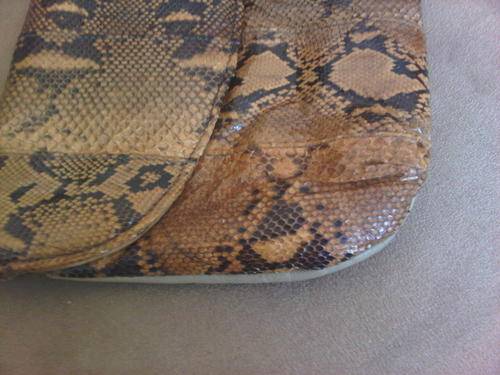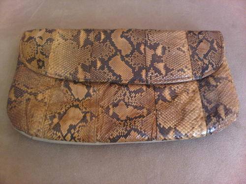 This second hand Vintage purse is in good condition with some wear to the skin on the corners and the opening clips down to close the purse and keep closed. The inside lining is a kind of silk and the brand is BALLY Creation Suisse. Quite an item to have and the feel is very unusual too as it was from a snake after all... There is a single pocket on the inside. The measurements are : 24.5cm x 15.5cm. The back is a Beige leather that i suppose is also proper leather.