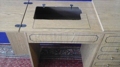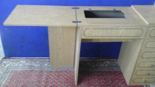 IT HAS MINOR SIGNS OF USE. OVERALL IT IS IN GOOD CONDITION. DOES NOT COME WITH A SEWING MACHINE.
