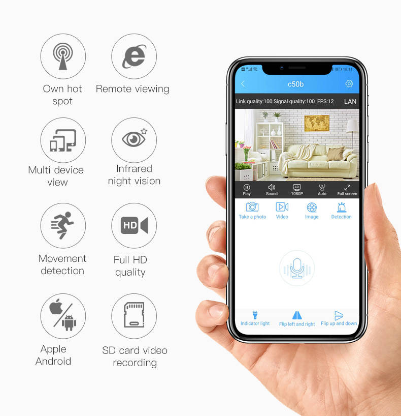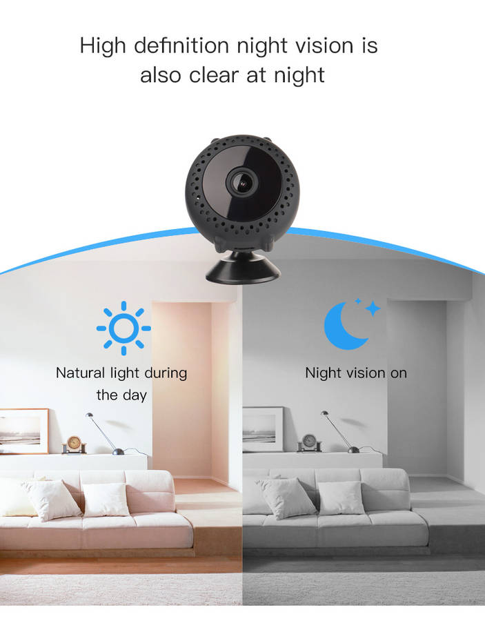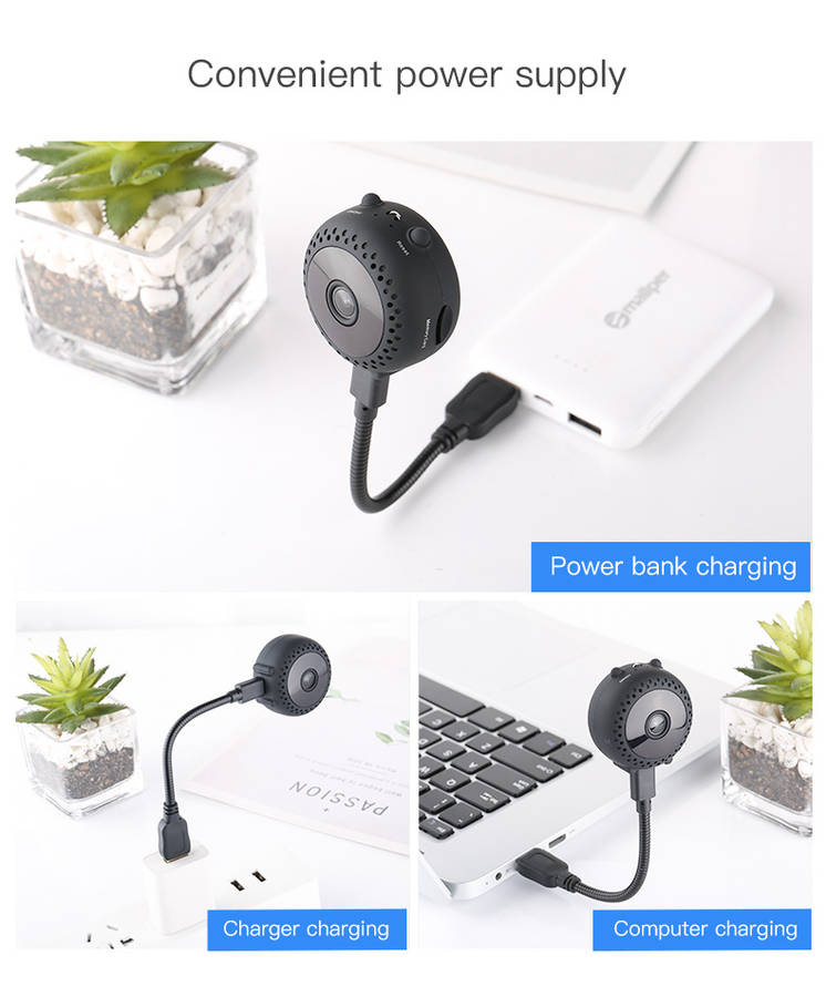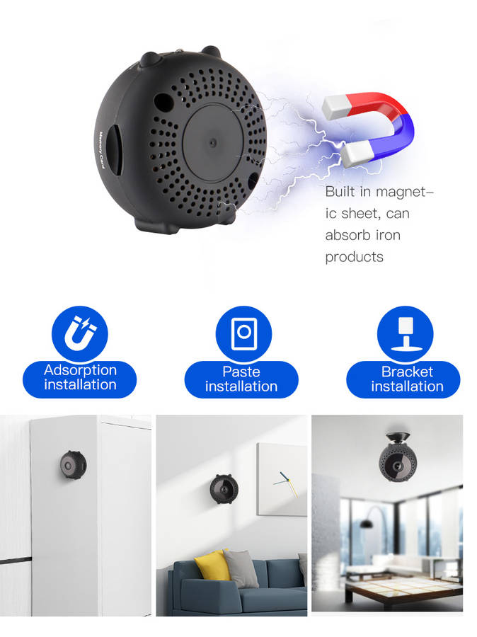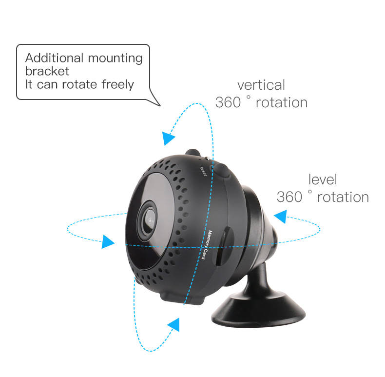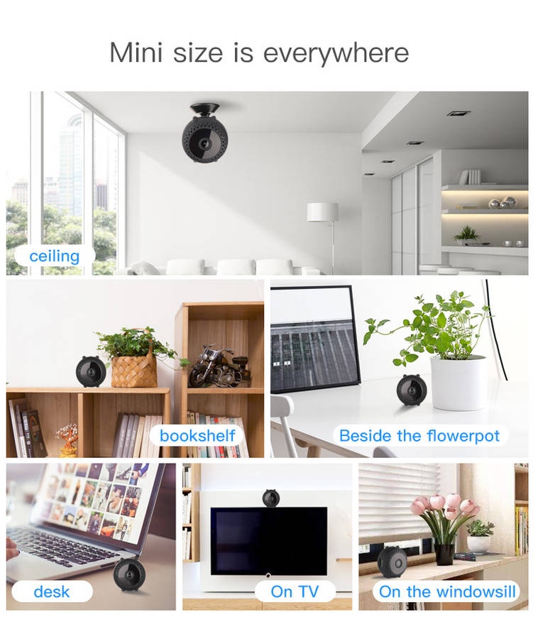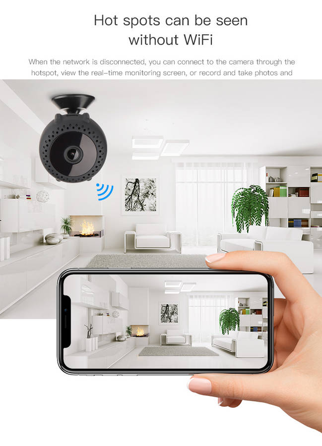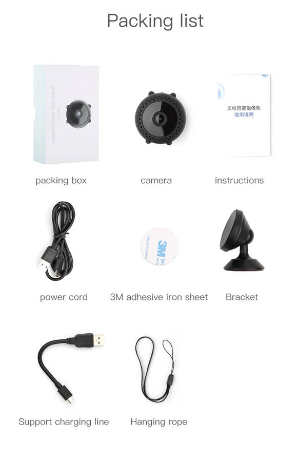 Description: MiniWifiCamera This mini security camera is the latest version. The image is clearer, Wi-Fi signal is stronger, decrease device heat, improve battery capacity. This camera is easy to carry and use. You can use it as home security camera, office and store monitoring, pet camera, dash camera, action cam, baby monitor . Remotely View Real Time Video on APPYou can view live streaming video when this small nanny camera is connected to wifi; This wireless security cam has a 150 degree wide angle, which make you can capture clearer and wider image. Record HD 1080P Videos to Micro SD Card Without Wi-FiOnly insert Micro SD Card (not included) into this mini nanny cam, next turn on this cam, next the mini wifi camera can auto record HD video to Micro SD Card without Wi-Fi; It can also record videos even if the network is offline. You don`t worry evidence is lost. You can use this mini wireless camera indoor and outdoor. Motion sensor Detection Alarm and RecordThis wireless camera will send push notification with images to your phone once motion is detected. You can also set motion sensor detection record on Micro SD card, it can save memory card capacity. 24/7 Monitoring with Night VisionThis wireless security cameras has 6 infrared led lights, it can capture clear image in the dark; This nanny camera supports battery powered and plugged into external power sources. Parameters: Video format: AVI Compressed format: H.264 Video resolution: 1920*1080P Working time: Full video recording 1-2 hours Vision: 150 degrees Interface type: mini 8PIN USB Minimum illumination: 1LUX Recording range: 25 square meters Video frame rate: 25fps Package included: 1 x Camera 1 x Power cord 1 x Bracket 1 x Data Cable 1 x 3M adhesive iron sheet 1 x Hanging rope 1 x Manual 1 x Packing box