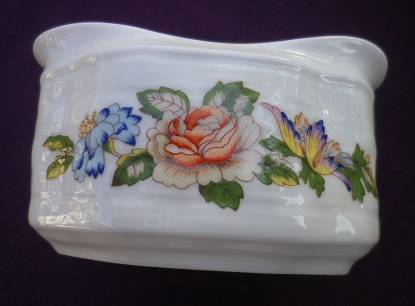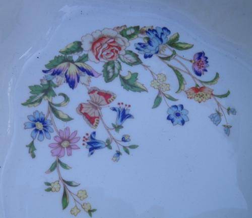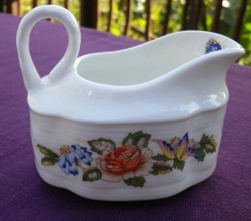 It is decorated with an abundance of bright flowers, birds and butterflies, & comprises a large, handled basket, into which fit removable cream jug & sugar basin