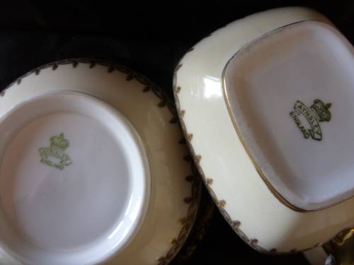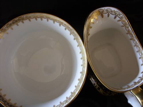 THESE FINE BONE CHINA PIECES ARE IN MINT CONDITION. IT HAS A MIDNIGHT BLUE BACKGROUND, BEIGE FOOT AND GILDED PATTERNING AROUND EDGES.