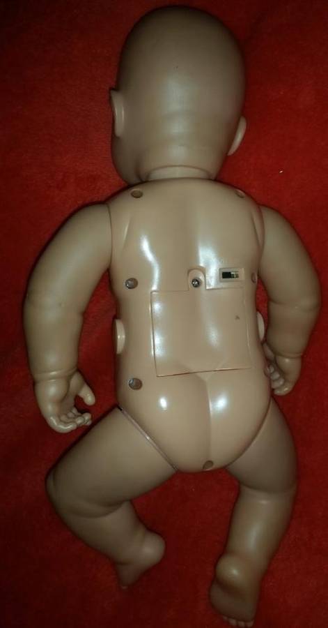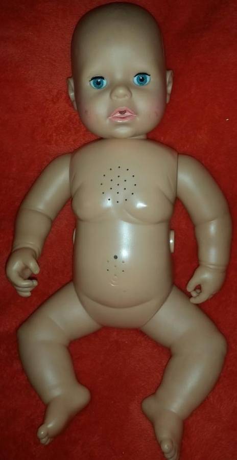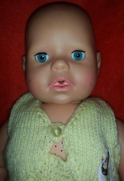 Little mommies will love cuddling with this posable baby doll. She sucks on her dummy and press the 2 buttons on her sides and her legs wiggles. she cries when her dummy is out of her mouth. she is 43cm tall