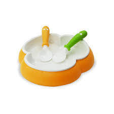 Well-conceived design: The three-leaf clover shape of the plate helps the child to scoop up food onto the spoon. The spoon is compatible with the plate’s shape and works using either the right or left hand. It has a short handle that is easy for small hands to grip.