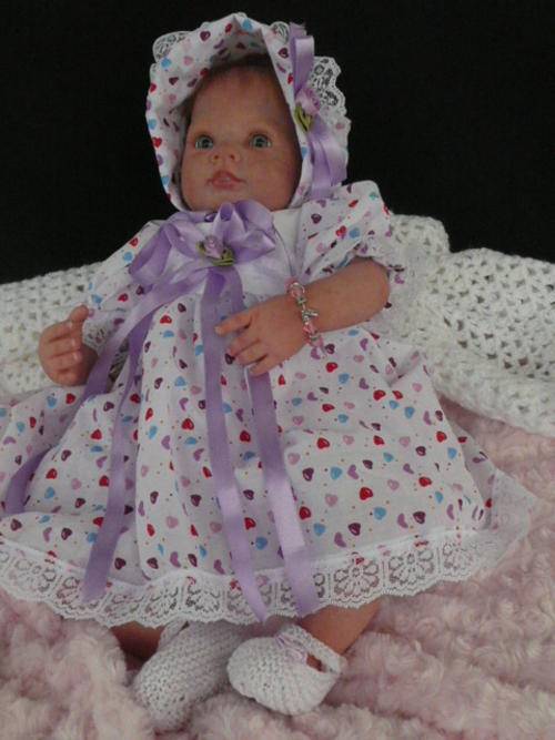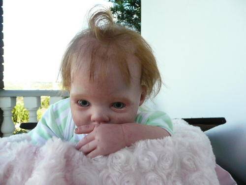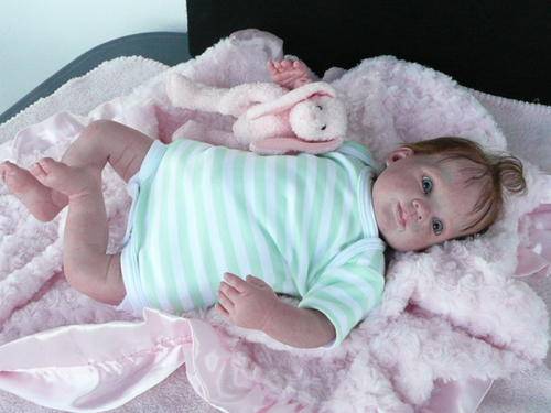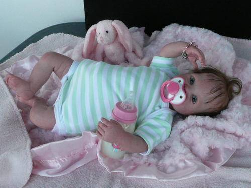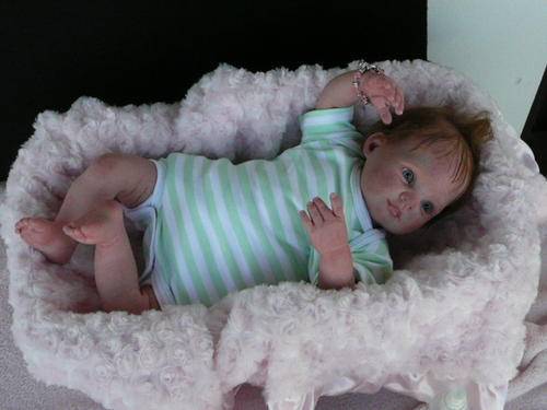 Baby Faye has been reborned from a Dumplin Sculpt. She has 3/4 limbs, weighs 1.8kgs, length 19ins. Fully jointed for easy posing, with a soft doe Suede body.