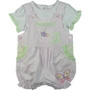 Baby Girl Romper Set by Baby Headquarters with Pink and White Gingham Check Romper with Flower and Butterfly Appliques, Green Plaid Trim Around Pockets and Flower Buttons. Underneath There is a White Creeper with Plaid Trimmed Sleeves and Pink Neckline.