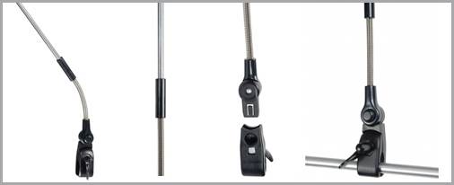 Moving to the shady side of life. Universal umbrella, can be attached to any pushchair. Anti-UV coating 50+. Detachable foot to remove umbrella. Flexible foot, swivelling at the base and top. Pressure fastening system.