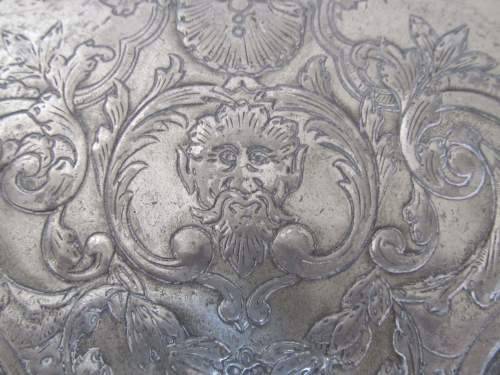 THE PLATE HAS A SCALLOPED RIM AND THE VERGE BESIDE THE RIM HAS BEEN DECORATED WITH ETCHED AS WELL AS EMBOSSED FLORAL AND PLUME DESIGNS AGAINST A LATTICE BACKGROUND. THE WELL OF THE PLATE HAS BEEN DECORATED WITH THE USE OF REPOUSSE AS WELL AS EMBOSSED GRAND BAROQUE SCROLL, LEAF AND PLUME FRAMING AN IMAGE OF BACCHUS (THE ROMAN GOD OF AGRICULTURE, WINE AND FERTILITY, EQUIVALENT TO THE GREEK GOD DIONYSUS)