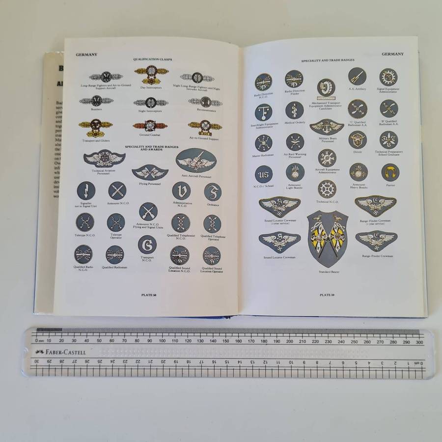 Reference book illustrating World War II air force, naval, and marine badges and insignia from multiple nations.