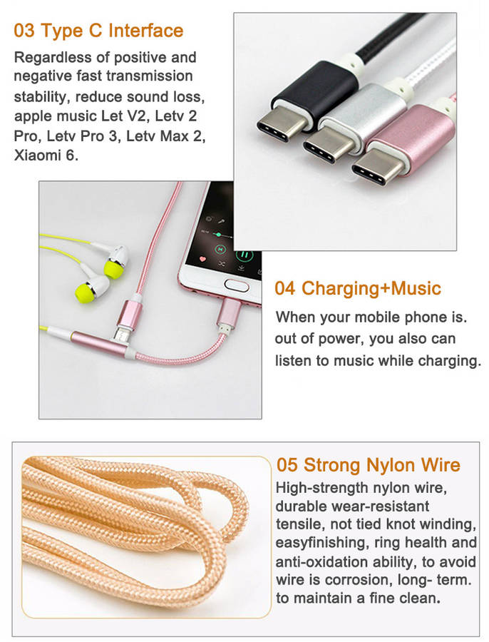 Features: 1. Portable size for you carrying it outsides; 2. Type-c to 3.5mm adapter, you can listen to music while charging your smart phone, much convenience; 3. Compatible with Xiaomi 6/ Letv 2/ Letv 2 Pro/ Letv Pro 3/ Letv Max 2 and some other type-c smart device;