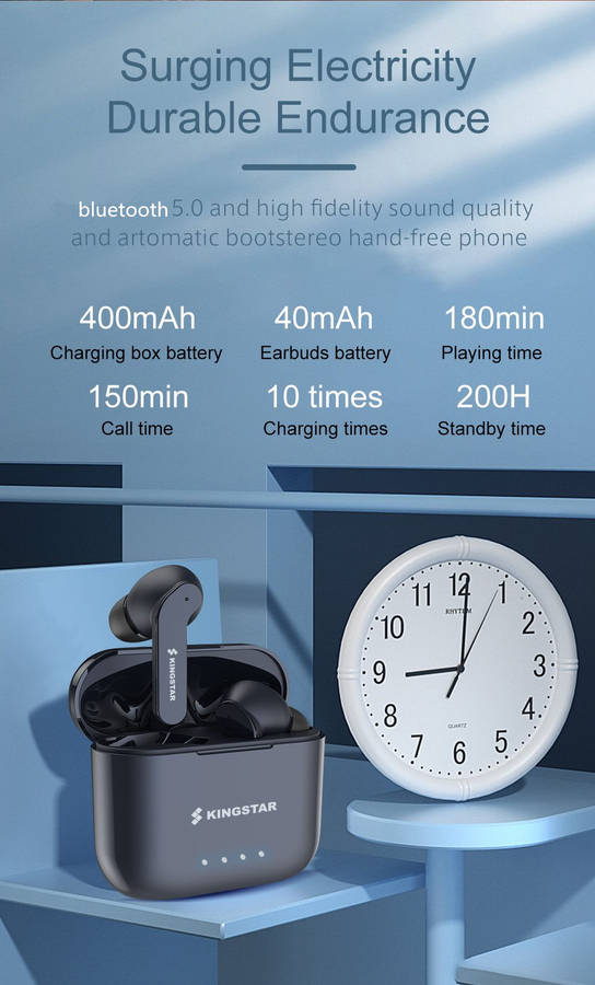 ? ? Features: -True Wireless Function. -High capacity in charging case. -Voice Report Calling Number. -Compact & Lightweight. -Convenient for Running, Driving, etc. Description: bluetooth Version: V5.0 bluetooth Distance: 10m Charging Time: about 1-2 hours Standby Time: about 80 hours Music Time:? about 3 hours Talking Time: about 4 hours? Earphone Battery: Polymer Lithium Battery 50mAh Battery Box Battery: Polymer Lithium Battery 500mAh Audio transmission format: HFP/A2DP/HSP/AVRCP Packing list: 1 x TWS bluetooth Earphones (left and right ears) 1 x 500mAh Charging Box 1 x USB Charging Cable 1 x User Manual