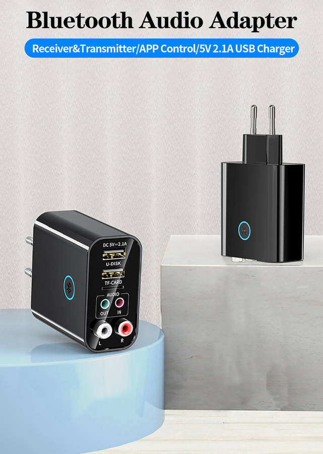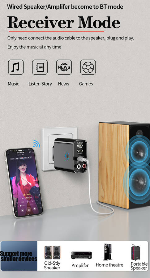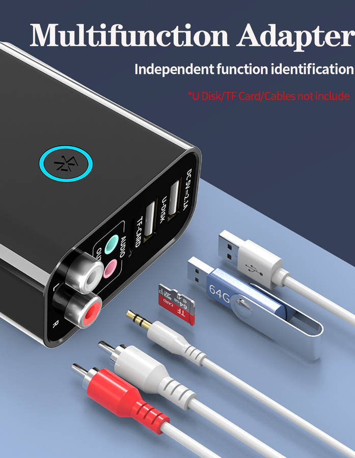 Insert TF card or U-Disk into the adapter. The adapter can automatically play music in TF card, and support mp3/WAV/FALC/APE format. It supports up to 64GB TF card or U-Disk