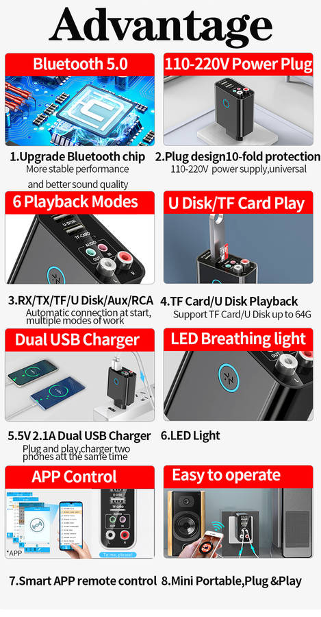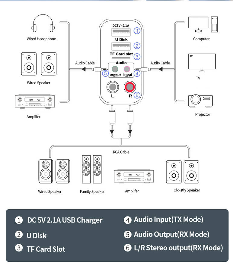 Support Devices: All kinds of speakers/Desktop computer/Laptop/TV/Power amplifier/Projector