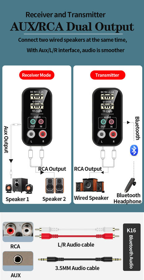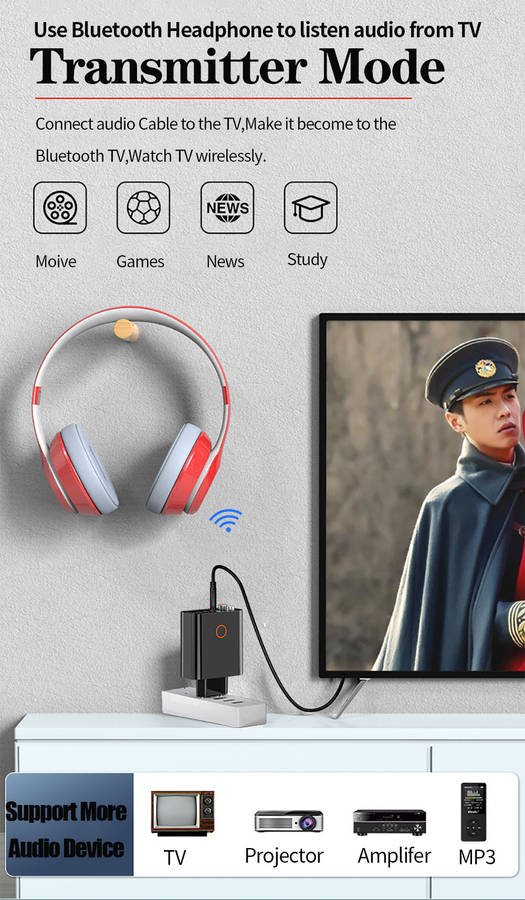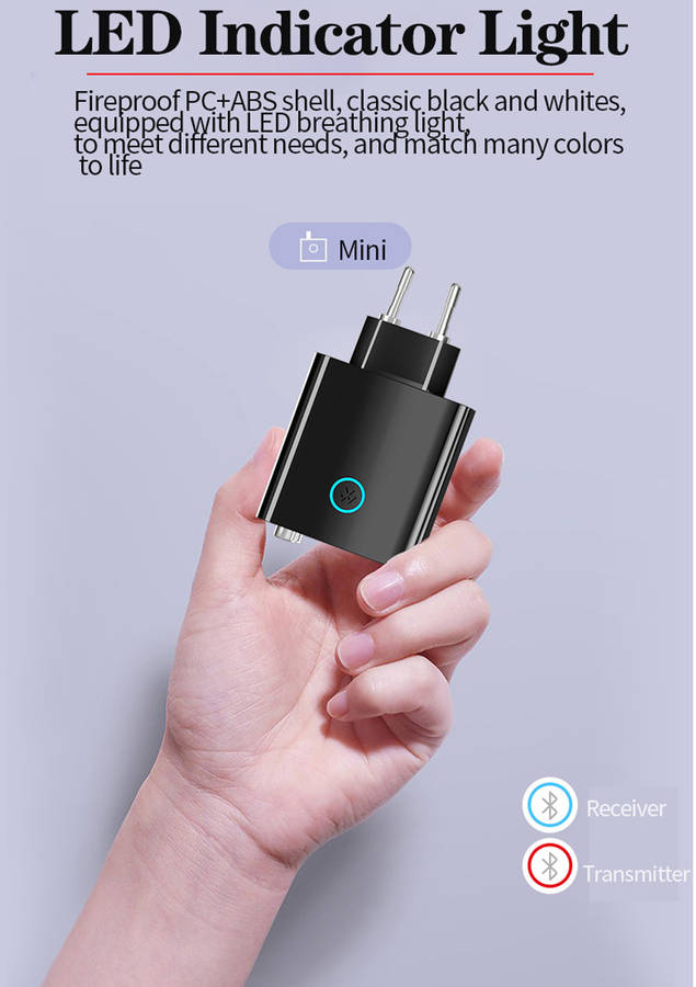 Transmit: The adapter can use 3.5mm AUX cable as audio input. The adapter transmits audio signal to paired headset or bluetooth speaker play music through bluetooth. (Note: At the same time, only one device can be paired at the same time.)