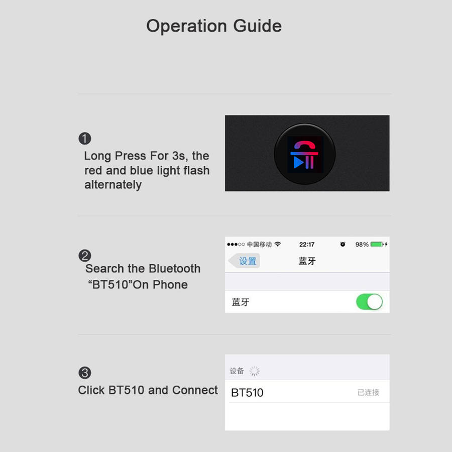 Pairing the Device: Long press the on/off button to pairing mode until blue LED lights flash quickly Find the pairing name BT510 on your phone or related sender and connect The blue LED lights will flash slowly after pairing successfully To complete pairing, some devices may need input password, please enter 0000
