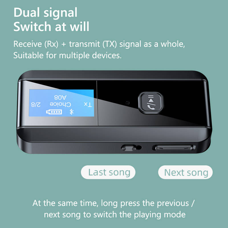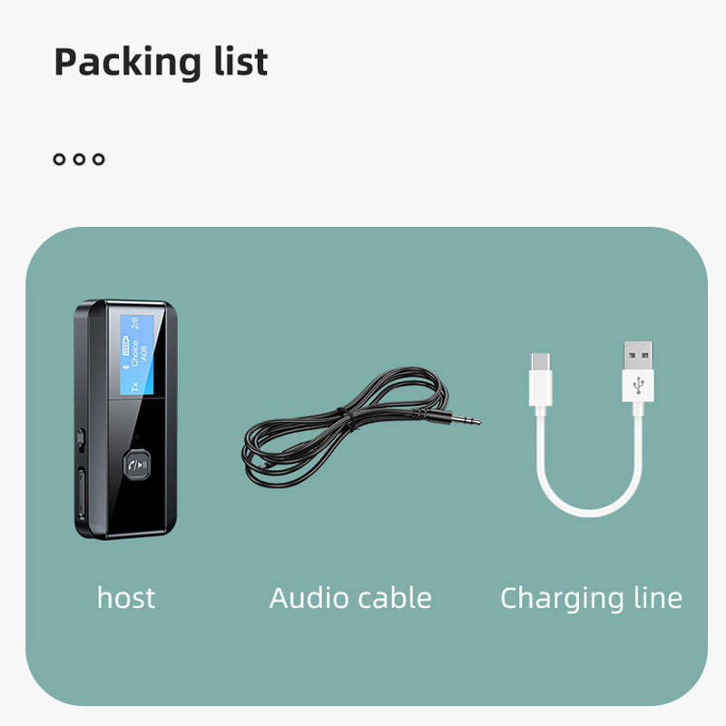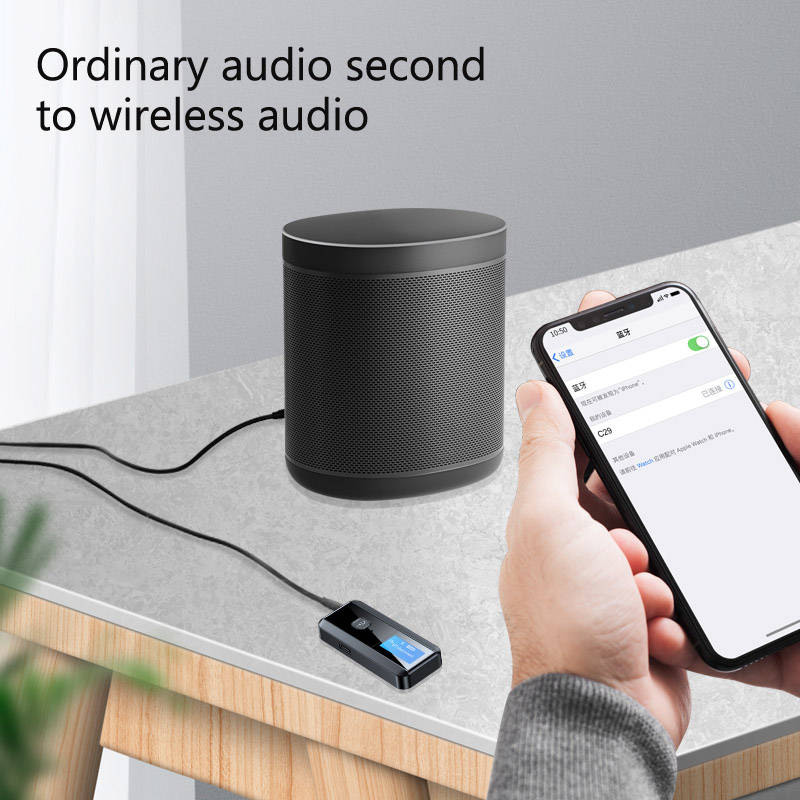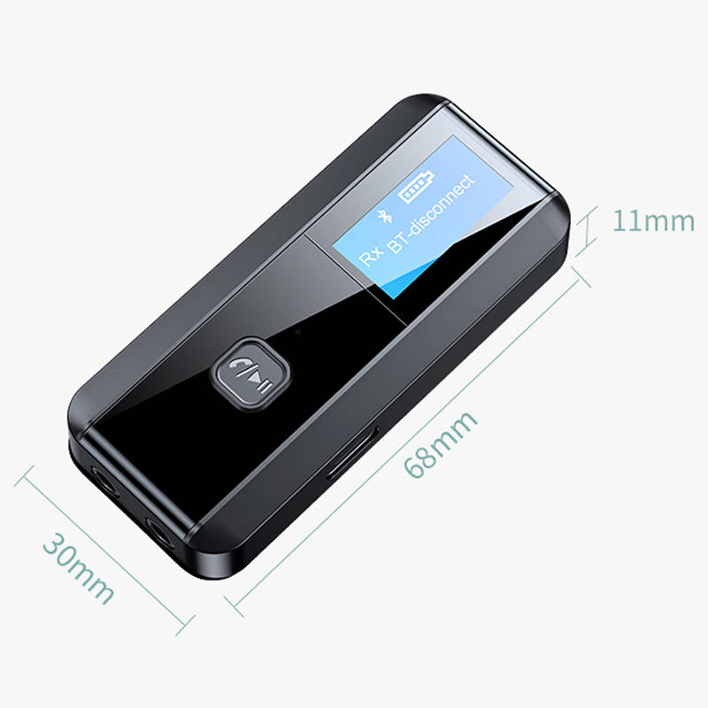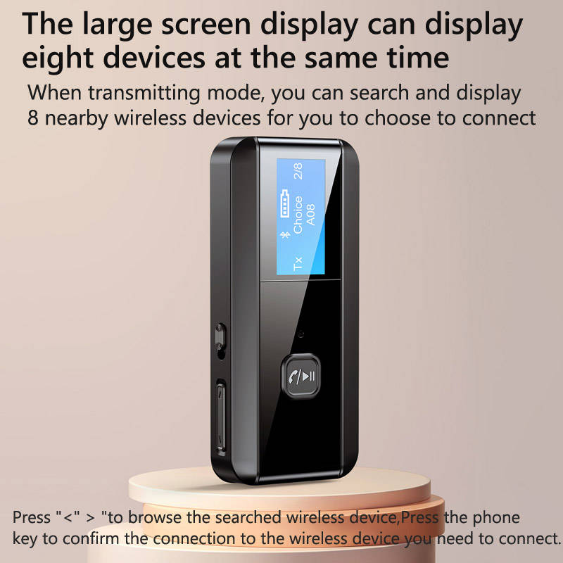 Specifications: Model: C29 bluetooth Version: 5.0 Frequency: 2.4GHz-2.48GHz bluetooth transmission distance a 10 meters bluetooth receiving distance a 10 meters Charging voltage: DC 5V The battery is 300 mAh Working time: about 6 hours bluetooth receiving function: connect 1 mobile phone bluetooth transmitter function: connect 1 pair of Bluetooth headsets Screen display: can display 8 devices at the same time. When transmitting mode, you can search and display 8 nearby wireless devices for you to choose to connect. Color: black