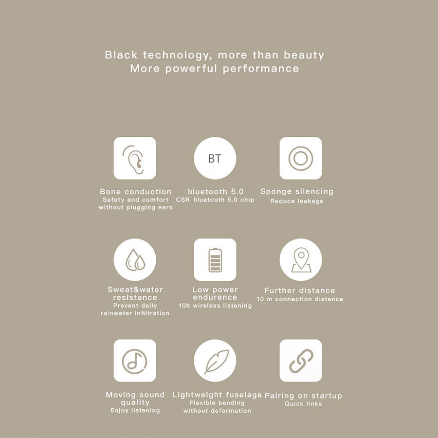 Features: -Compared with the old Bluetooth 5.0, the stable full core upgrade greatly improves the signal stability and anti-interference ability, and reduces the standby power consumption -Built in 130 mAh battery, low power consumption Bluetooth intelligent fast charging -It adopts advanced CVC (clear voice capture) noise reduction technology, and through full duplex noise elimination technology, it can provide voice and environmental noise elimination function, and bring better bluetooth experience. -Large dynamic ecological diaphragm trumpet with directional audio lossless transmission creates 6D surround sound field -Bone conduction open timbre can transmit sound directly to the ear through bone without passing through the eardrum, thus reducing the damage to eardrum hearing and protecting hearing. Listening to music can also pay attention to external sound. Specification: Model Number: DY1 Style:Bone-conduction, Ear Hook, Headband, EARBUDS Communication:Wireless, Bluetooth 5.1 Connectors:USB Bluetooth Standard:Bluetooth v5.1 Active Noise-Cancellation:No Feature:Comfortable Battery capacity:130mAh Package Included: Package Included: 1 * Bone-conduction Earphone 1 * Charging Cable 1 * Manual