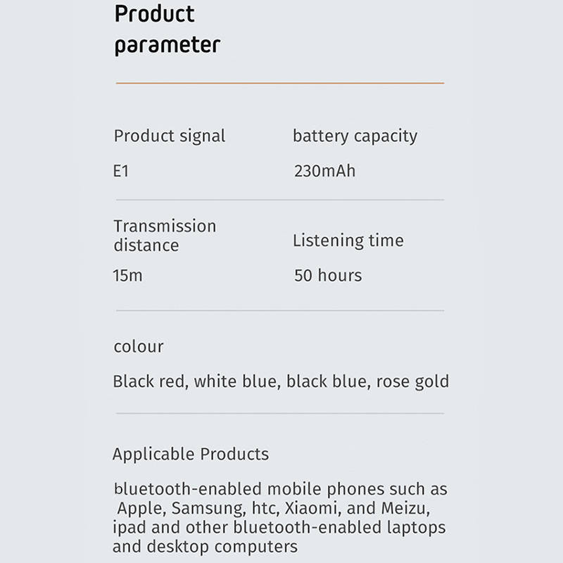 | Product | Bakeey E1 bluetooth Headset Stereo Ear-Hook Wireless Earphones 50 Hours Mini Sports Earbuds In-Ear Headphones With Silicon Microphone |