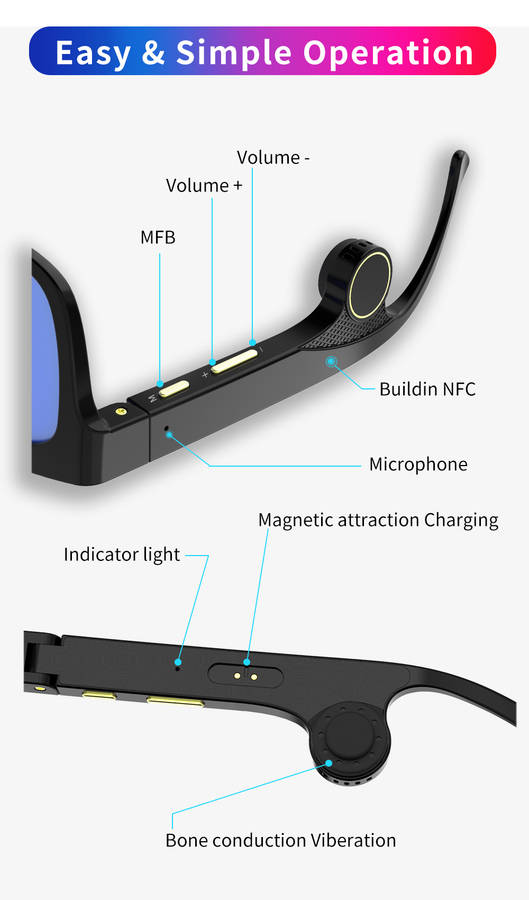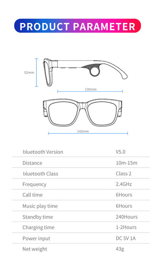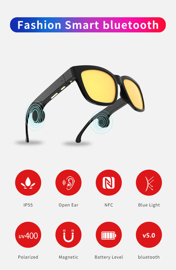 Features: -Compared to BT,the up-to-date BT5.0 makes connecting faster and more stable.Transmisson speed has been increased 2 times,enjoy learning more -IP55 waterproof apply to more situation -Double touch M button to active voice assistant which can help you with quick setting and open apps -NFC Connect easier connect way now is availble -Polarized UV400 TAC Lens. Specification: Model: G2 bluetooth: V5.0 + BLE bluetooth Class: Class 2 bluetooth Chip: CSR8635 bluetooth Distance: 10-15m Battery: 200 mAh Frequency Range: 20Hz-20KHz Charge Time: 2 hours Charge Voltage: DC 5V, Max 1A Standby Time: 240 hours Music Play Time: 6 hours Conversation Time: 5 hours Weight: 42g Packing List: 1 * G2 Sunglasses 1 * Sunglasses Cloth 1 * User Manual 1 * Magnetic Usb Cable