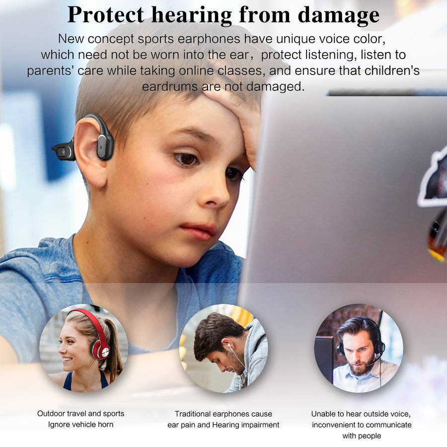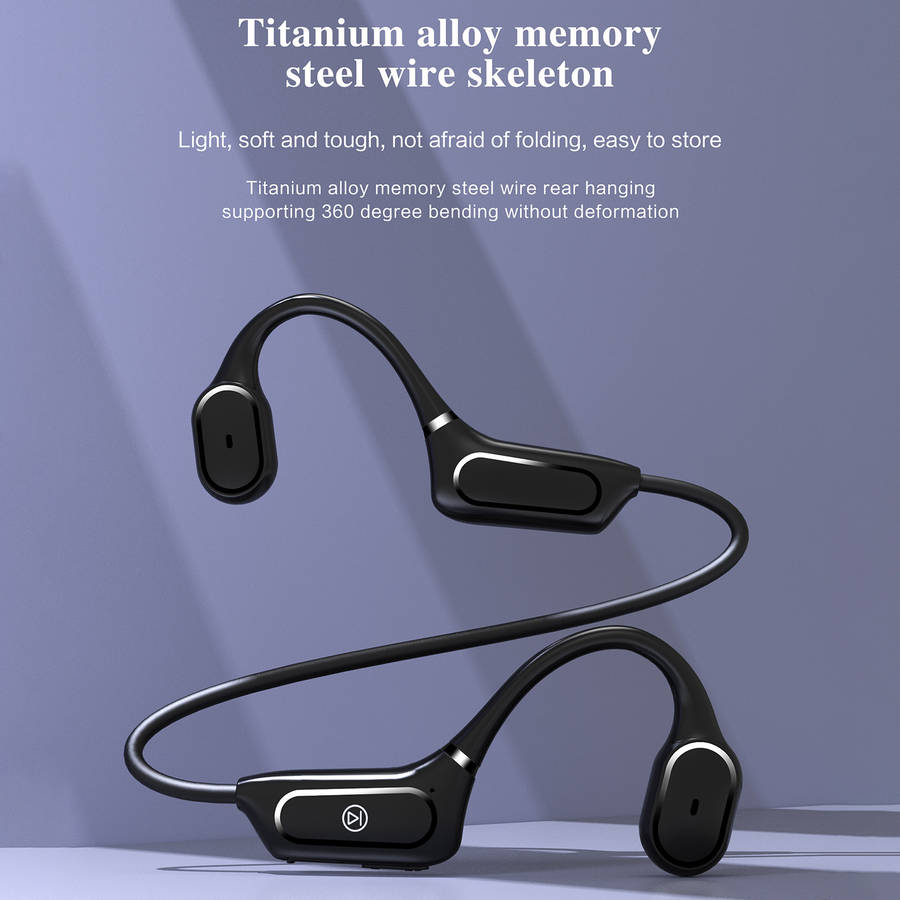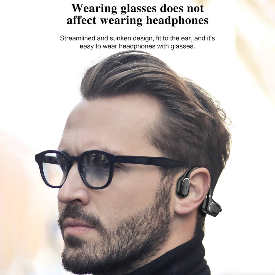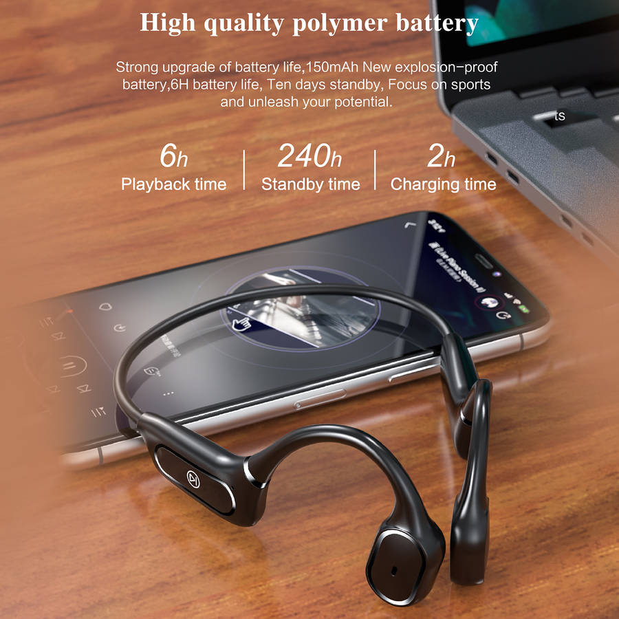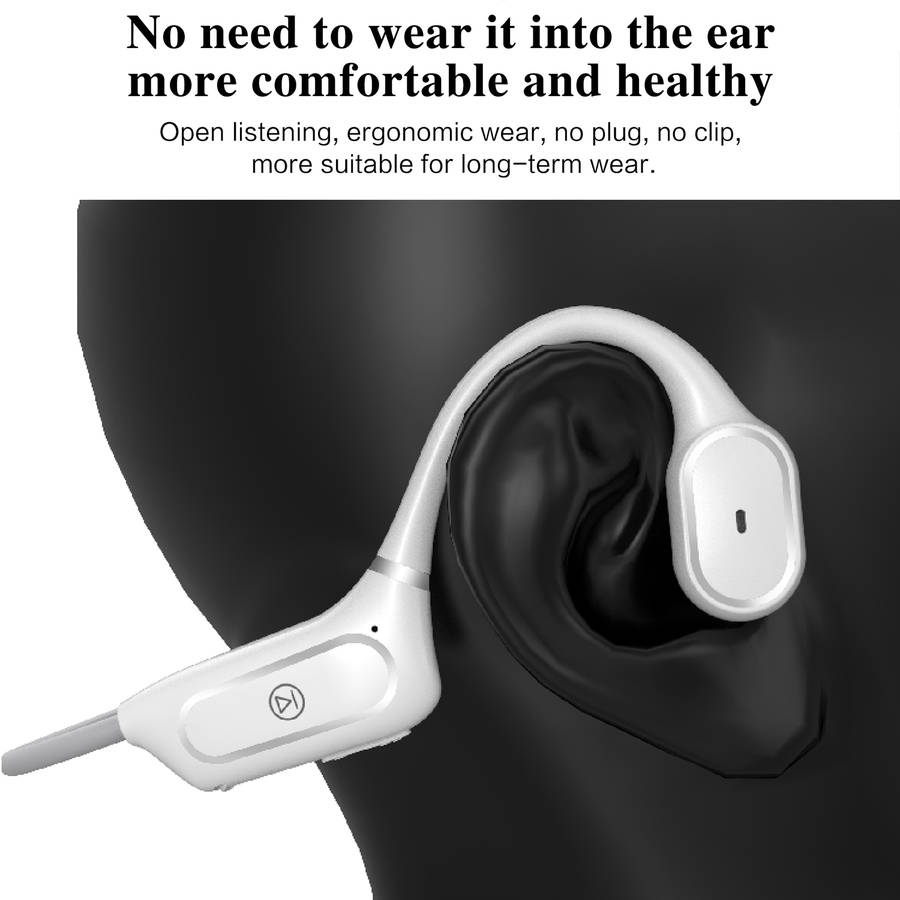 Features: -Wireless headphones with bluetooth 5.0 less consumption and convenient multipoint pairing, these are compatible with your iOS and Android devices. -Open-ear design closes to the ear bone, sound waves directly transmitted to the acoustic system to enjoy high-quality music while not hurting the ear. -Bone conduction technology delivers music through your cheekbones, ensuring ears remain completely open to ambient sounds for maximum situational awareness during long-term wear. -150mAh high-quality li-polymer battery, stronger battery endurance. 6 hours of a continuous phone call and 120 hours of standby. It only takes 2 hours to charge. -Memory flexible titanium alloy wraparound supports. 360ᆪ bending without deformation, very stable to wear, and will not fall with strenuous exercise and wear for a long time without pain. -Only one button for multi-functional control. Get rid of tedious operations and make life easier. -IPX5 for daily waterproof use, sweatproof and water-resistant, enjoy outdoor activities freely. Specifications: Model: H11 Type: Headset bluetooth Version: V5.0 Material quality: PC+ABS Transmission Distance: 10-15 m Frequency response range: 80HZ-20KHZ Battery: 150mAh Lithium Polymer Battery Operating Time: 6 hours Talk Time: 10 hours Charging Time: 2 hours Standby Time: 10 days Charging Interface: Micro USB bluetooth Profiles: HFP, HSP, A2DP, AVRCP Noise Reduction: CVC 6.0 Waterproof Grade: IPX5 Package Included: 1 * Earphones 1 * Manual 1 * Charging Cable