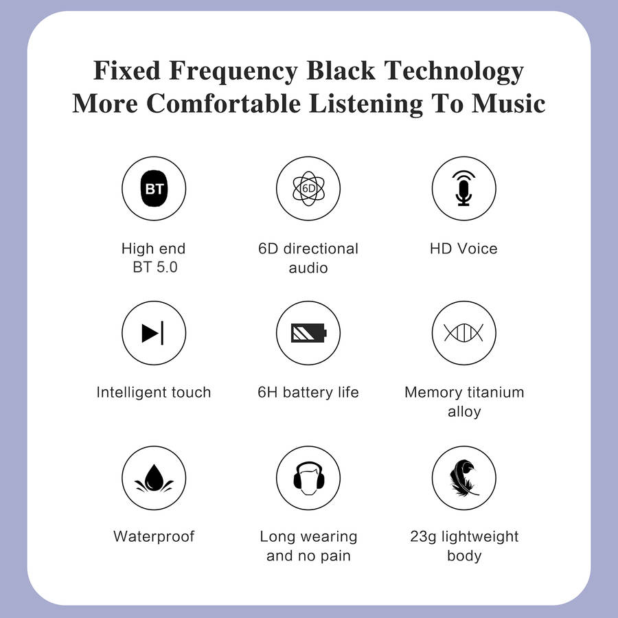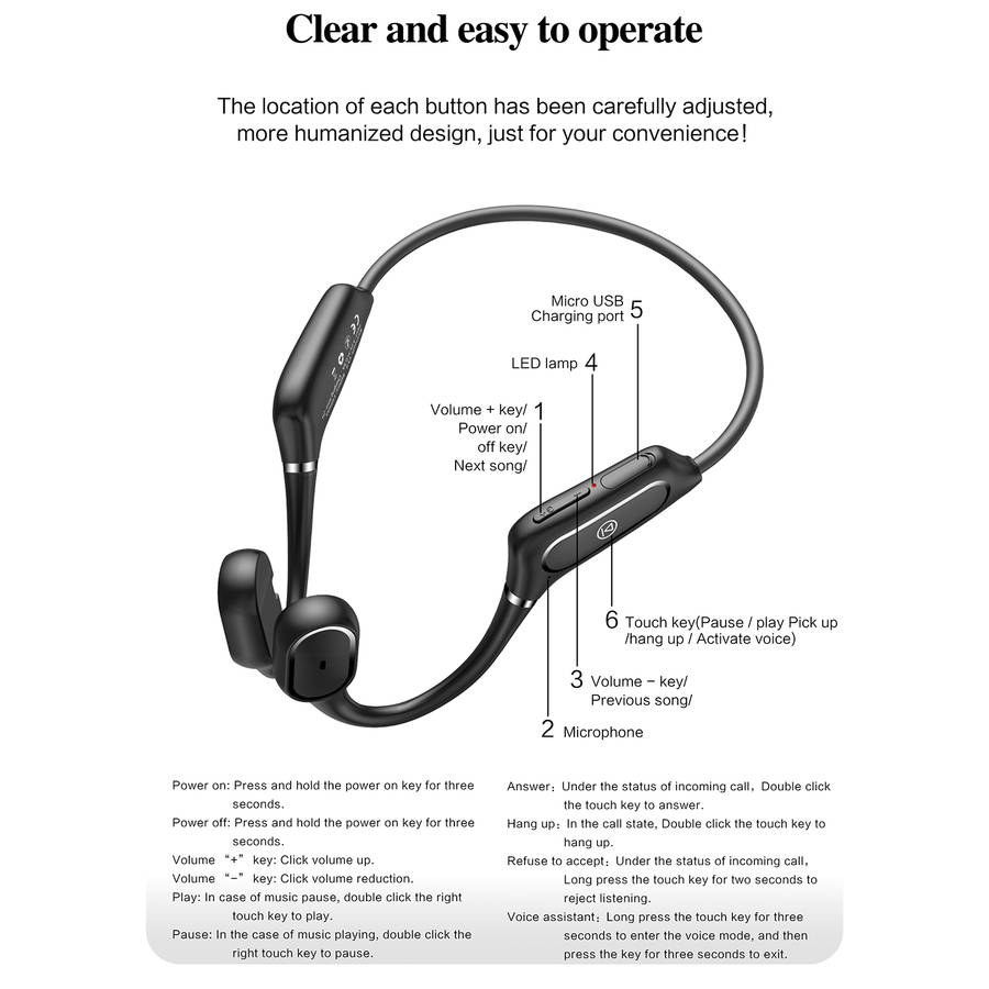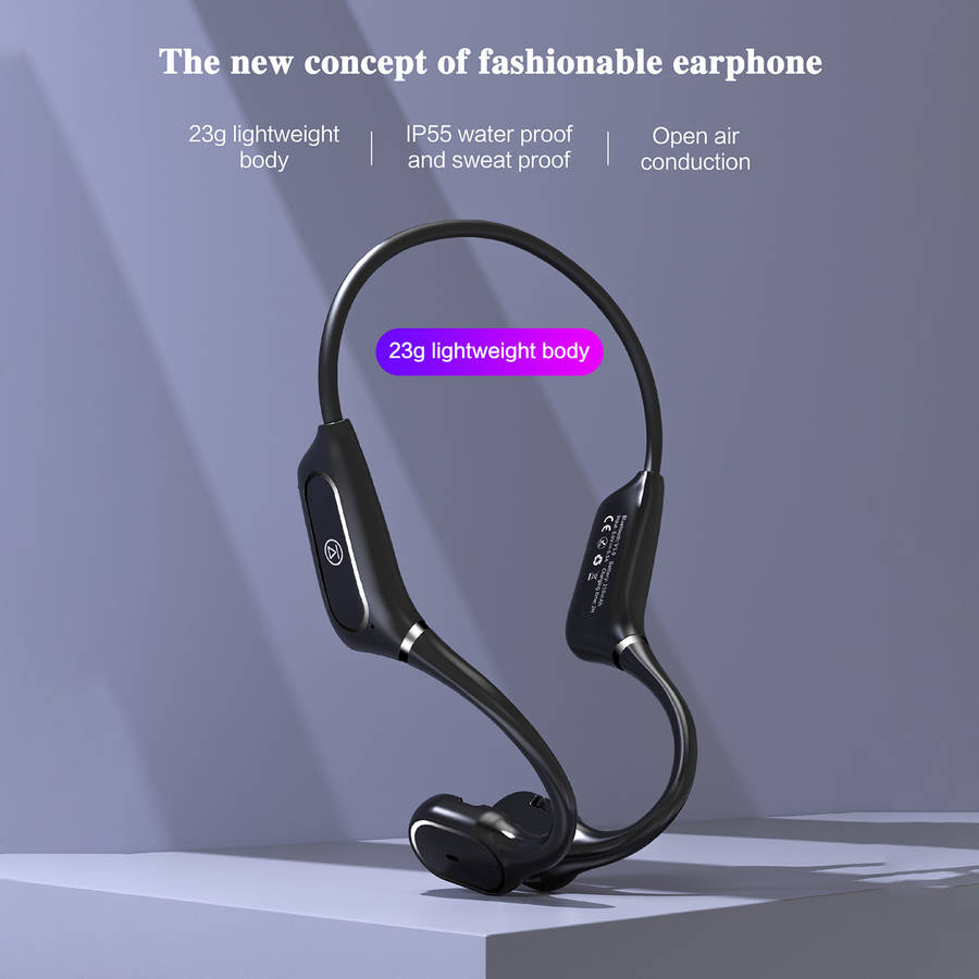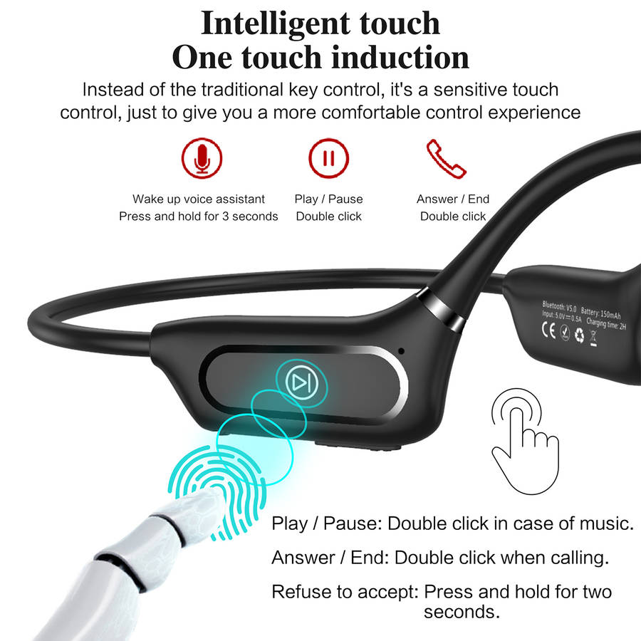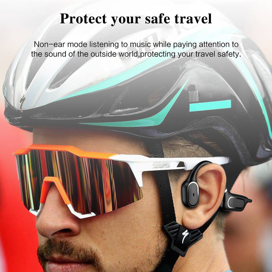 Features: -Wireless headphones with bluetooth 5.0 less consumption and convenient multipoint pairing, these are compatible with your iOS and Android devices. -Open-ear design closes to the ear bone, sound waves directly transmitted to the acoustic system to enjoy high-quality music while not hurting the ear. -Bone conduction technology delivers music through your cheekbones, ensuring ears remain completely open to ambient sounds for maximum situational awareness during long-term wear. -150mAh high-quality li-polymer battery, stronger battery endurance. 6 hours of a continuous phone call and 120 hours of standby. It only takes 2 hours to charge. -Memory flexible titanium alloy wraparound supports. 360ᆪ bending without deformation, very stable to wear, and will not fall with strenuous exercise and wear for a long time without pain. -Only one button for multi-functional control. Get rid of tedious operations and make life easier. -IPX5 for daily waterproof use, sweatproof and water-resistant, enjoy outdoor activities freely. Specifications: Model: H11 Type: Headset bluetooth Version: V5.0 Material quality: PC+ABS Transmission Distance: 10-15 m Frequency response range: 80HZ-20KHZ Battery: 150mAh Lithium Polymer Battery Operating Time: 6 hours Talk Time: 10 hours Charging Time: 2 hours Standby Time: 10 days Charging Interface: Micro USB bluetooth Profiles: HFP, HSP, A2DP, AVRCP Noise Reduction: CVC 6.0 Waterproof Grade: IPX5 Package Included: 1 * Earphones 1 * Manual 1 * Charging Cable