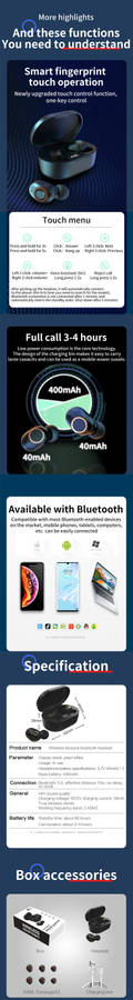 LongBatteryLife: 40mAhbatteryineachheadphoneensures3-4hoursofworkingtime.Theearphoneandthechargingcasecanbefullychargedin1-2hours.