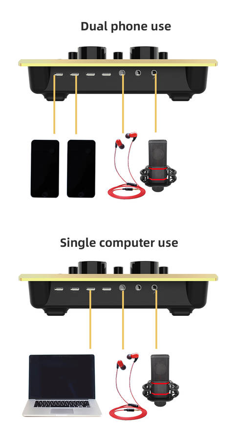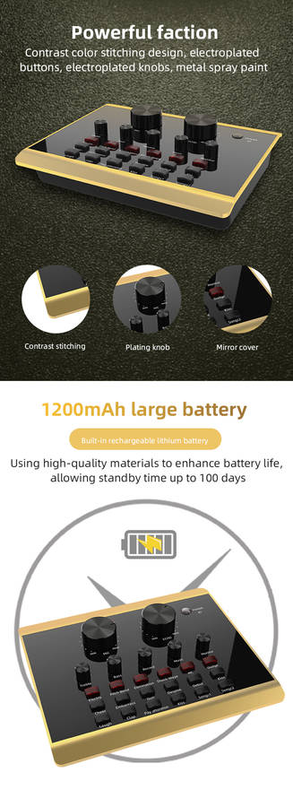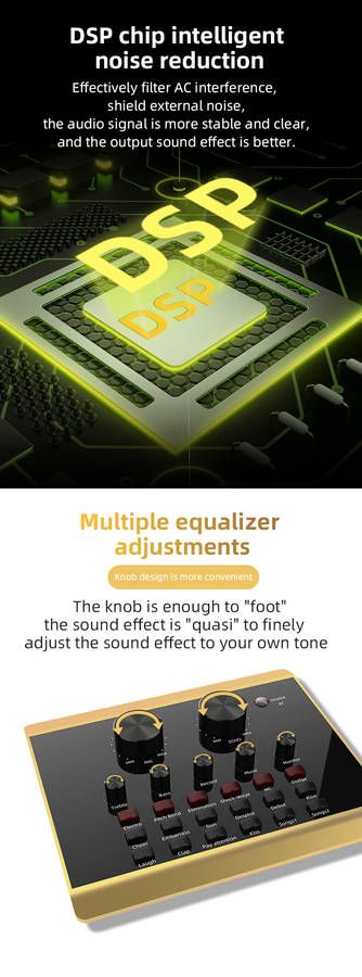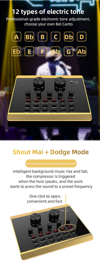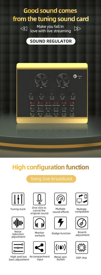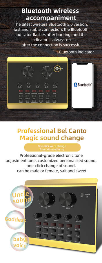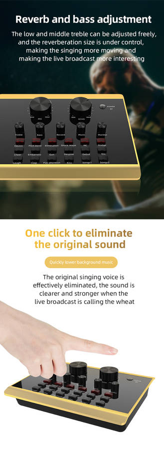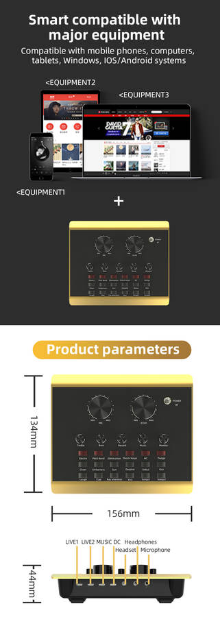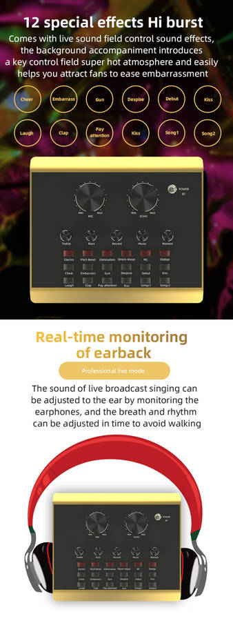 Features: Made of ABS material, firm, durable and long service life. It can be used for mobile phone live broadcast, computer live broadcast, WeChat, QQ, phone voice funny chat. Mini and compact, easy to use and carry. Fine workmanship, 12 kinds environment sound effect(cheers, embarrassment, shooting sound, disdain, debuts, kiss 1, laugh, clap, pay attention, kiss 2, song 1, song 2) and 6 kinds sound effect(electronics, tone bending, magic, shockwave, MC, Dodg). Set with microphone headphone, to meet your live broadcast requirements. Control knob with microphone volume, treble, bass, recording volume, music volume and monitor volume adjustment. With LIVE1, LIVE2 and accompaniment instrument USB jack; 3.5mm headphone speaker and headphone output jack; 3.5mm condenser microphone and 6.35mm dynamic microphone input jack. Support bluetooth connection, compatible with smart phones, PC, laptops, support mainstream live streaming software YY, Tik Tok, etc.