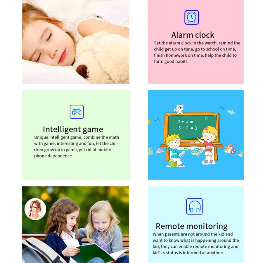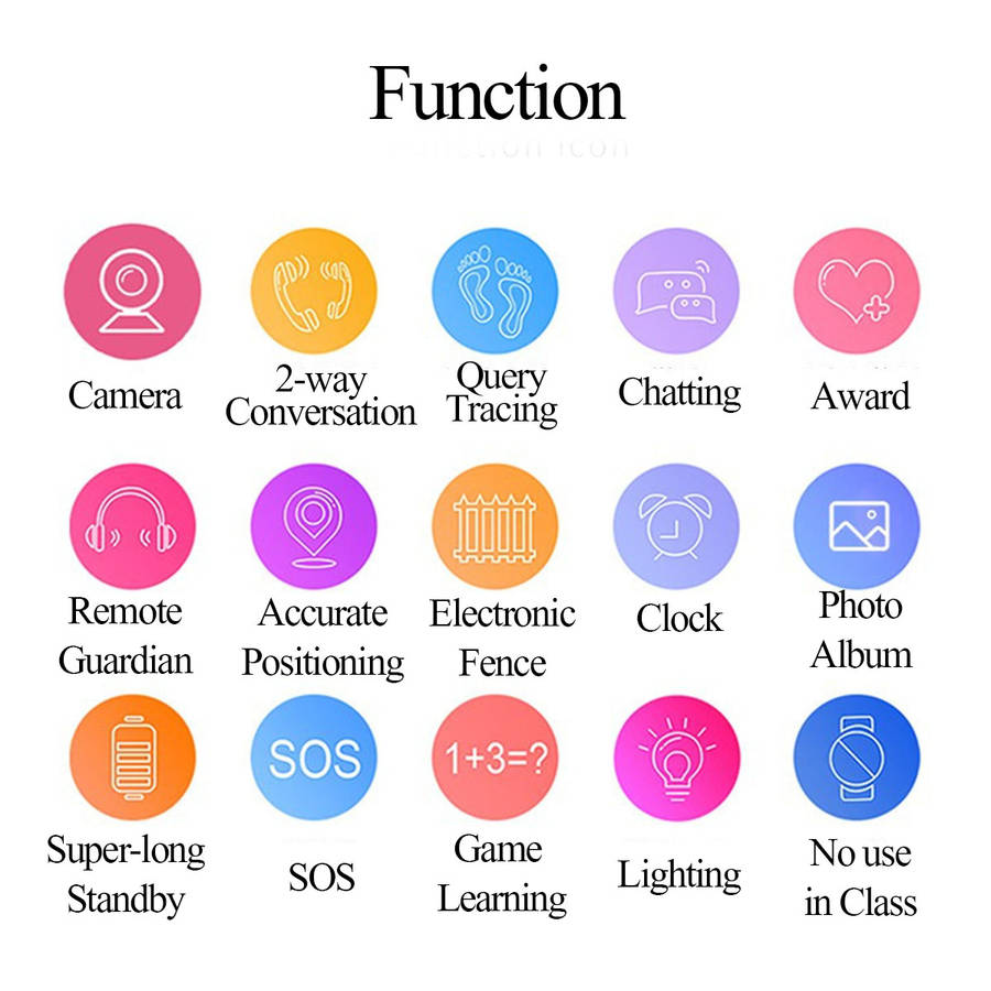 Dual Control Mode Positioning, Tracking, Monitoring, Phone Book, Intercom, Footprint, Alarm Clock, SOS Emergency Alarm, Low Battery Alarm, Remote Shutdown, Games, Camera, Photo Album, Flashlight