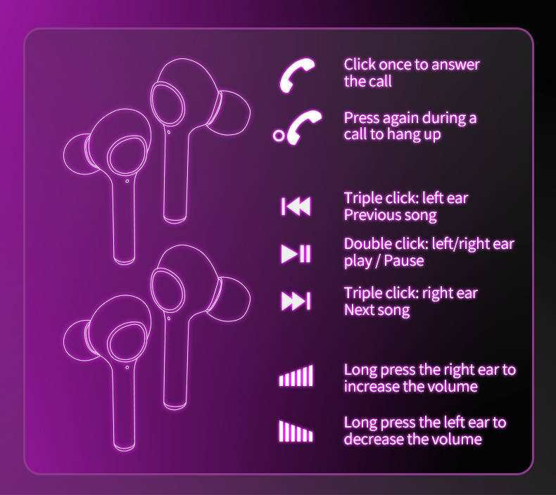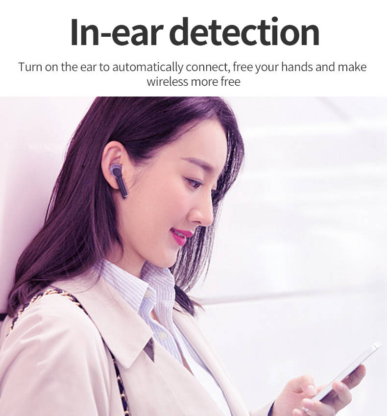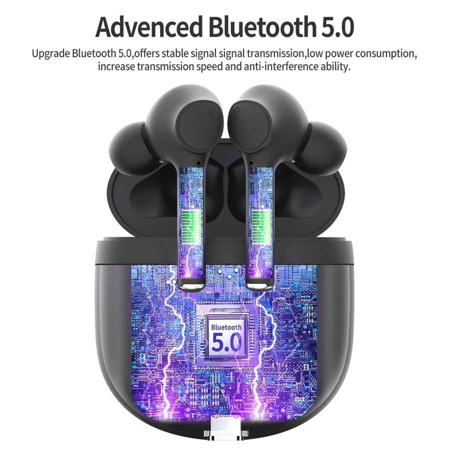 1. This True Wireless bluetooth earphones feature Bluetooth 5.0 chip, automatic boot pairing, built-in active noise reduction IC, HD call and large capacity lasting battery life.       2. This product features 14.2 graphene diaphragm, professional alloy sound-transmitting network, high-fidelity sound, intelligent noise reduction, 108dB sensitivity, oxygen-free copper voice coil.       3. Two Connection Methods: Single / double free to use, single ear listening to enjoy alone, listening to HiFi stereo in both ears.       4. Smart Touch Operation: Automatic power on/off / answer / reject / last song / next song / call Siri.       5. It ensures 5.0 bluetooth game without delay.