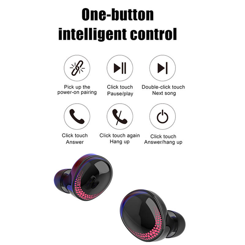 Features: 1. Adopt true wireless 5.0 technology, strong wireless signal. You can enjoy skip-free music in a 10-meter working distance. 2. Touch control design for easy use. 3. 6D surround sound, lossless sound, DSP noise reduction, HiFi sound quality which can deliver high quality music and enjoyable listening experience for compatible devices. 4.Displaying remained power: Displaying the remained power to remind you to re-charge in time, making sure youad never suffer from no-power headache 5. Waterproof design for which it will be available when wearing in a rainy day and gyming. 6. Comfortable to wear, ergonomic design and with no pain for long time wearing, it will not fall off when running. 7. Strong compatibility and compatible with IOS Android devices. 8. With 3000mAh charging box design, it can keep full battery state. And necessary for driving, working, indoor and outside sports. 3000mAh storage can provide 260 hours use for earphones. Specifications: bluetooth version: bluetooth 5.0 Operating mode: tactile Working range: approximately 10 m Music time from a single handset: around 4H Battery capacity of a single headset: 60mAh Battery capacity: 3000mAh Water resistant: Waterproof diary