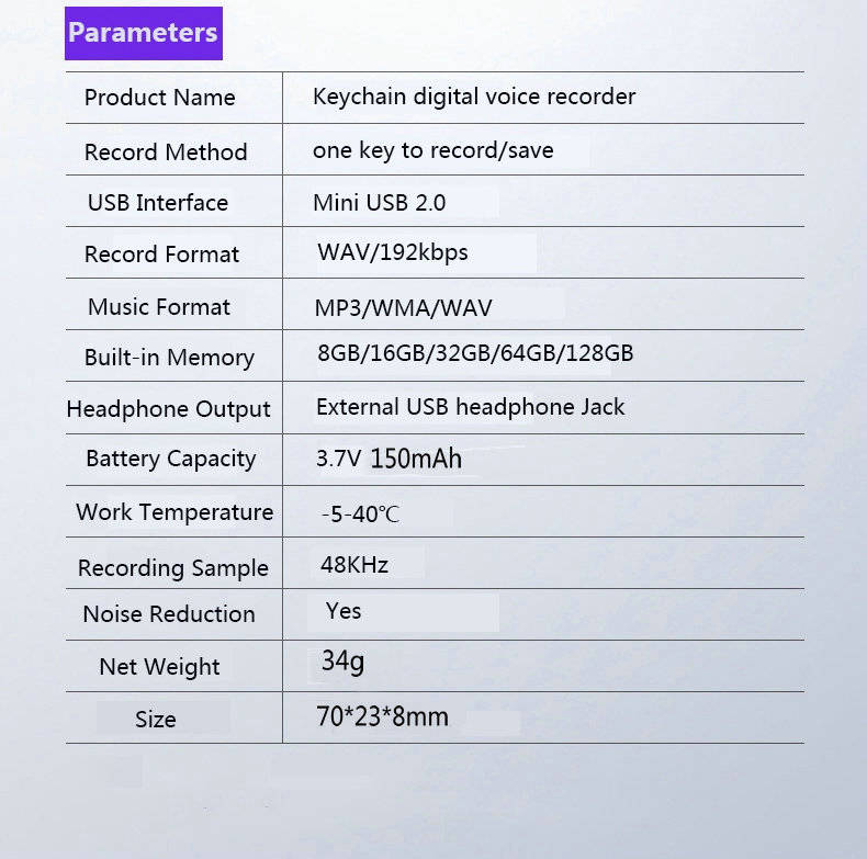 Features: -Shell made from metal and zinc alloy material, anti-fall strongly -Professional recording pen chip of ATJ3315D, HD recording -Timestamp,Name the recording files by date automatically -AGC function, adjusts the noise source automatically -Voice Recorder,MP3 player,and USB flash drive -Support voice activated recording -Detect low battery and save the recording files automatically -Playback function: One key to record/save -Plug into headphones to listen to music -USB adapter -Long battery life -Built in rechargeable 150mAh lithium battery -USB 2.0 connector , easy to upload and download files -Color: Black/Silver Specification: Recording Format: WAV/192kpbs Music Playback Format: WMA/WAV/MP3/OGG etc. audio format Battery Recording Time: About 15 hours Battery Playing Time: About 10 hours Battery: 150mAh lithium battery Battery charging time: About 2 hours Noise-signal ratio: 80db USB Interface: USB 2.0 High Speed 16GB Saving recording time: About 188H/ 32GB saving recording time: About 376H Working Temperature: -5 to 40 degrees Recording Sample Rate: 48KHZ Headphone: USB interface Compatible System: Windows 2000&above Size(mm): 70*23*8 (L*W*T) Net Weight: About 34g Color: Silver Package Included: 1 * Silver Voice recorder 1 * English manual 1 * USB data cable