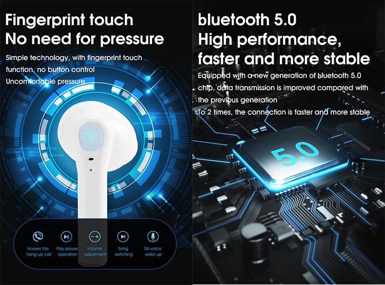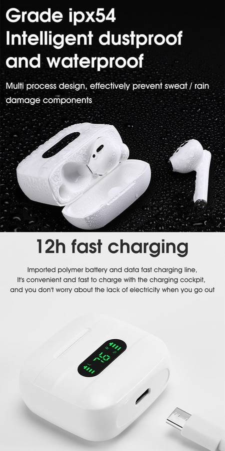 -HiFi high fidelity sound surging heavy bass. -bluetooth 5.0 chip: lower power consumption, more stable. -Water and sweat resistant, waterproof for everyday use. Specification: Model: V12 Product name: HiFi 3D surround TWS wireless Bluetooth headset Codecs: LHDC/SBC/AAC Style: In-ear Communication: Wireless bluetooth Standard: bluetooth v5.0 Waterproof Standard: IPX-54 Standby time: 120 hours Feature: Waterproof Earbuds/Comfortable Wearing/TWS 5.0 Color: White/Blcak/Colors Customized Transmission Distance: more than 15 m Usage: PC/MP3/Mobilephone/Tablet/Laptop/Audio Devices Charging time: 1 Hour Battery capacity: 300mAh Earphone Battery Capacity: 50mAh