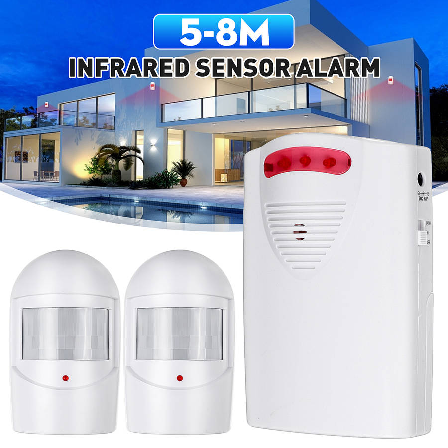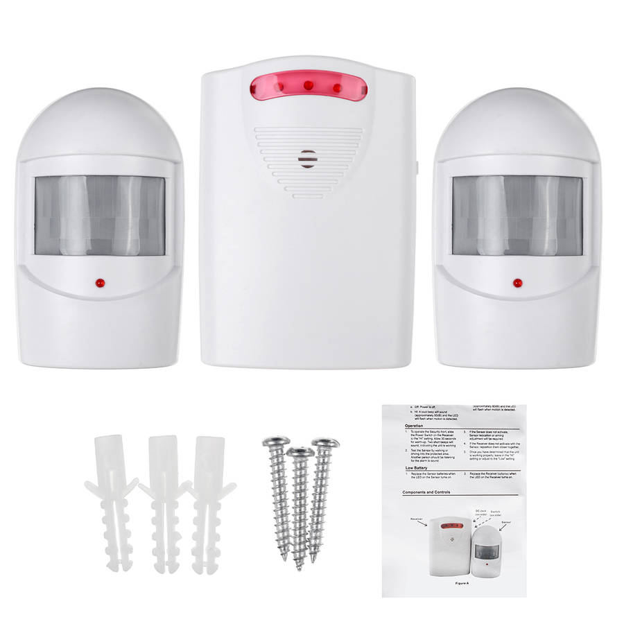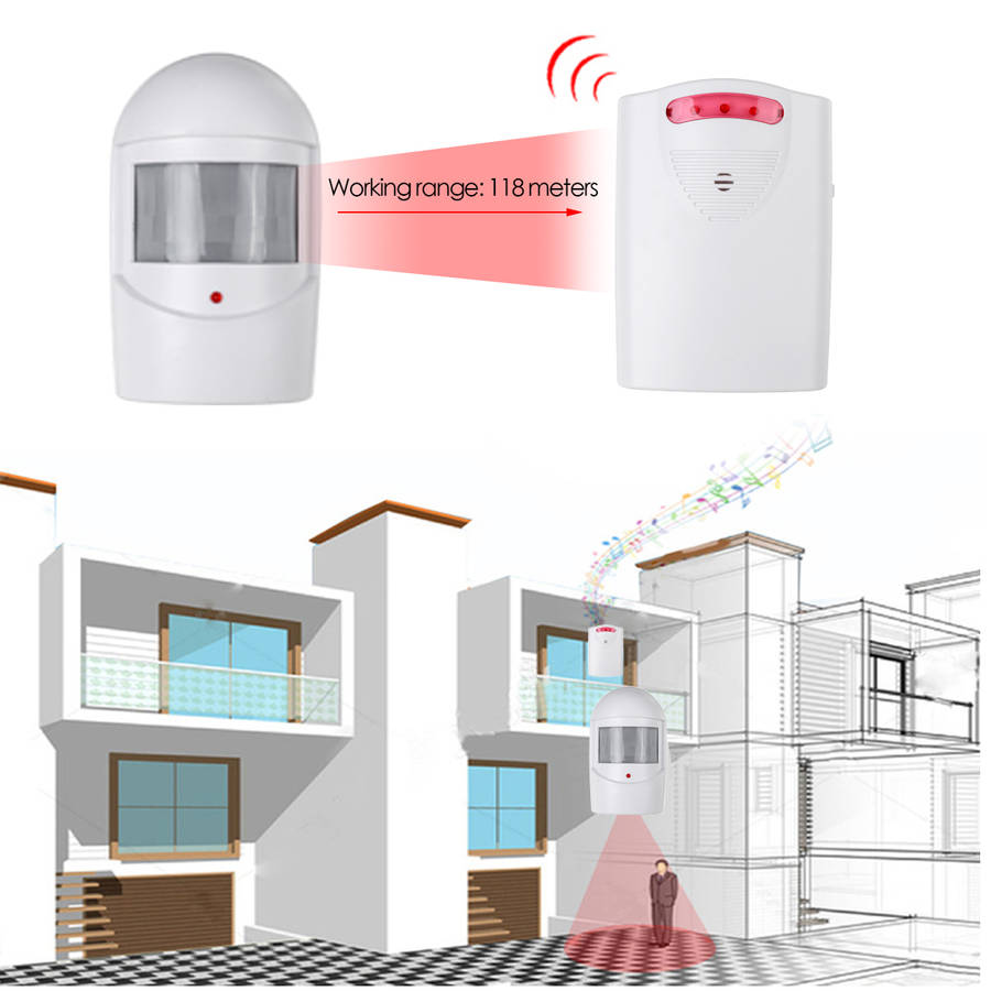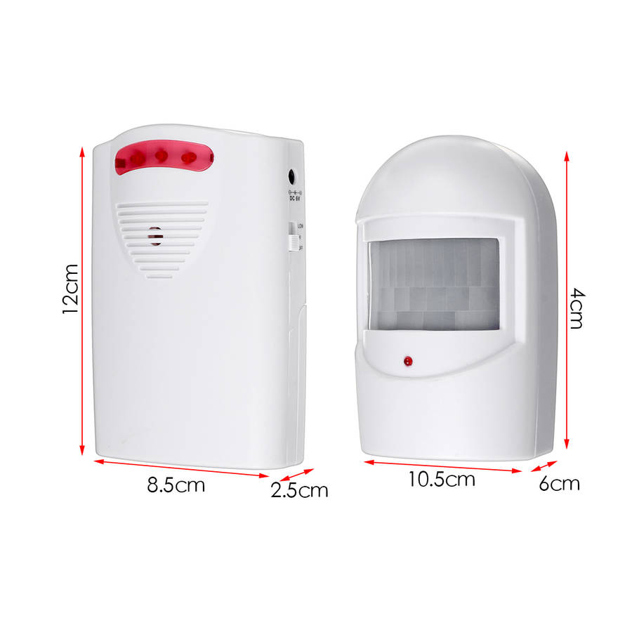 Features: 1.With a sensing range of 5-8m 2. Four sounds, adjustable volume 3. Easy to install and can be used with any doorbell kit 4. The light flashes and alarms, not disturbing children who are taking a nap 5. The protection level of the remote control transmitter is 6.The sensor and alarm have a sensing range of 118 meters and strong signal penetration 7. The number of sensors and alarms can be freely combined Specifications: Color: White Power receiver: DC 6V or 1.5V 3 AA batteries(not included) Transmitter DC: 9V. 6F22 not included Range: 5-8 meters Working range: 118 meters 3 modes: LED flashing, sound, LED flashing Ringer volume: 1-120 dB Operated sensor size: 10.5x6x4cm/4.1x2.4x1.6`` Receiver size: 12x8.5x2.5cm/4.7x3.3x0.9`` 4 sound options: 1. Hello, welcome 2. HELLO.WELCOME 3. The sound of the police car 4. Double Ding Dong Package Included: 2x Bell Alarm Operated Sensor 1x Receiver 3x Screws 1x English Manual