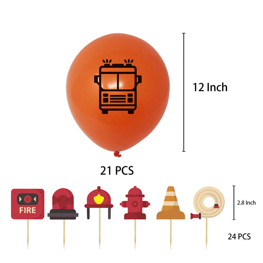 1. Package Include - 1 fire truck birthday flag, 24 pcs fire truck cake inserts, 2 engineering vehicle aluminum foil balloons, 7 yellow + 7 red + 7 orange balloons