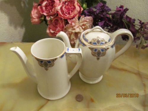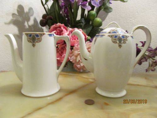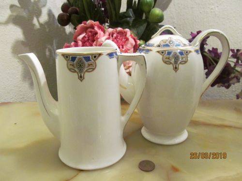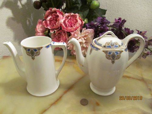 A VINTAGE LOT/SET WHICH CONSISTS OF A TALL AND SLENDER DESIGNED COFFEE/TEA POT AND OPEN MILK/WATER JUG, MANUFACTURED BY GRINDLEY, TUNSTALL DURING THE 1950's AND DECORATED IN THE RARE BALMORAL PATTERN WHICH HAS BEEN DISCONTINUED. THE TEA/COFFEE POT IS LIDDED AND TOPPED BY AN ARCH FINIAL AND DESIGNED WITH MILDLY FLUTED SIDES, A PROMINENT SCROLL HANDLE AND STANDARD GOOSE NECK SPOUT WHILE THE OPEN MILK/WATER JUG HAS A FLARED BASE, GOOSE NECK SPOUT UNUSUAL IN A MILK OR WATER JUG, AND AN ART DECO STYLED HANDLE