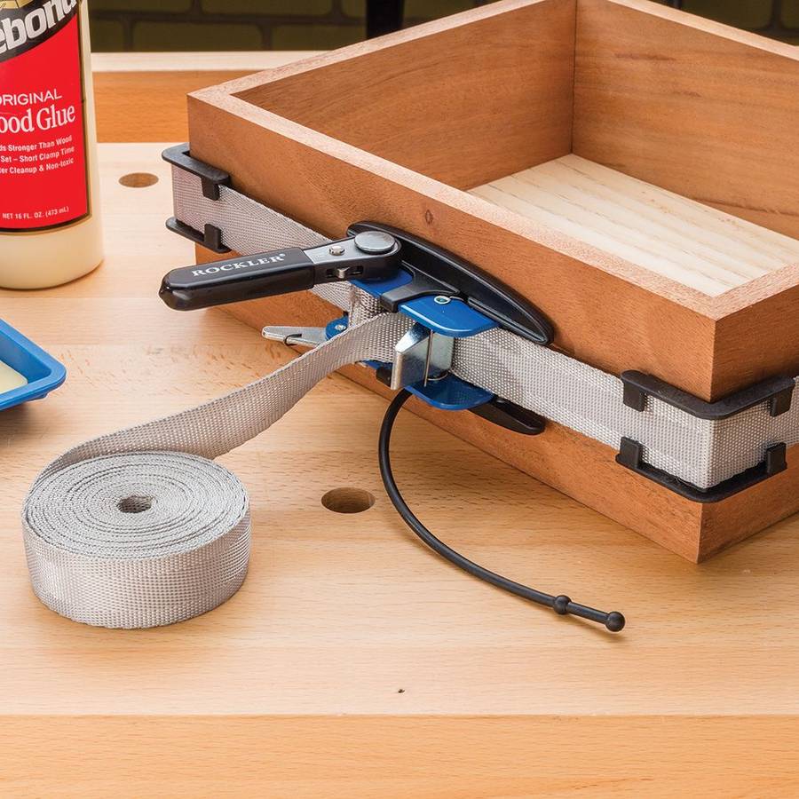 This accessory kit is designed for use with the Rockler 1'' x 15' Band Clamp (#58432, sold separately), as well as older Rockler band clamps. The plastic boot slips over the ratcheting mechanism to help align the nylon band when you roll it up, and includes a rubber retainer strap that holds the band in a neat folded position when in storage. The boot also has a foam pad that protects your workpiece from the metal parts on the clamp mechanism. Includes four corner brackets that allow you to clamp rectangular objects more easily, and help to prevent glue from soiling the nylon strap.