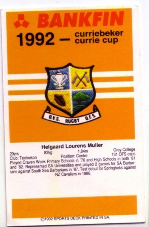 Bankfin Currie Cup 1992 Rugby Trading Card - Helgaard Muller